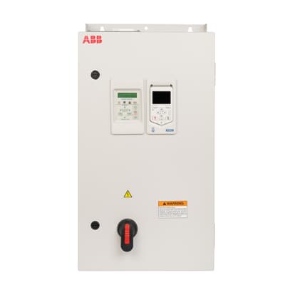 The ACH580 with ABB E-Clipse bypass has an integrated UL (NEMA) Type 1, 12 or 3R enclosure with a bypass motor starter and is available from 1 to 350 hp at 230/460/575 V. The ACH580 with ABB E-Clipse bypass provides an input disconnect switch or circuit breaker with door mounted and interlocked switch (padlockable in the OFF position), a bypass starter, electronic motor overload protection, a door mounted control panel with graphical display for local control, provisions for external control connections, and serial communications capability