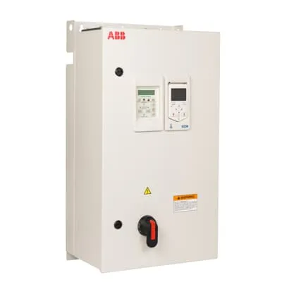 The ACH580 with ABB E-Clipse bypass has an integrated UL (NEMA) Type 1, 12 or 3R enclosure with a bypass motor starter and is available from 1 to 350 hp at 230/460/575 V. The ACH580 with ABB E-Clipse bypass provides an input disconnect switch or circuit breaker with door mounted and interlocked switch (padlockable in the OFF position), a bypass starter, electronic motor overload protection, a door mounted control panel with graphical display for local control, provisions for external control connections, and serial communications capability
