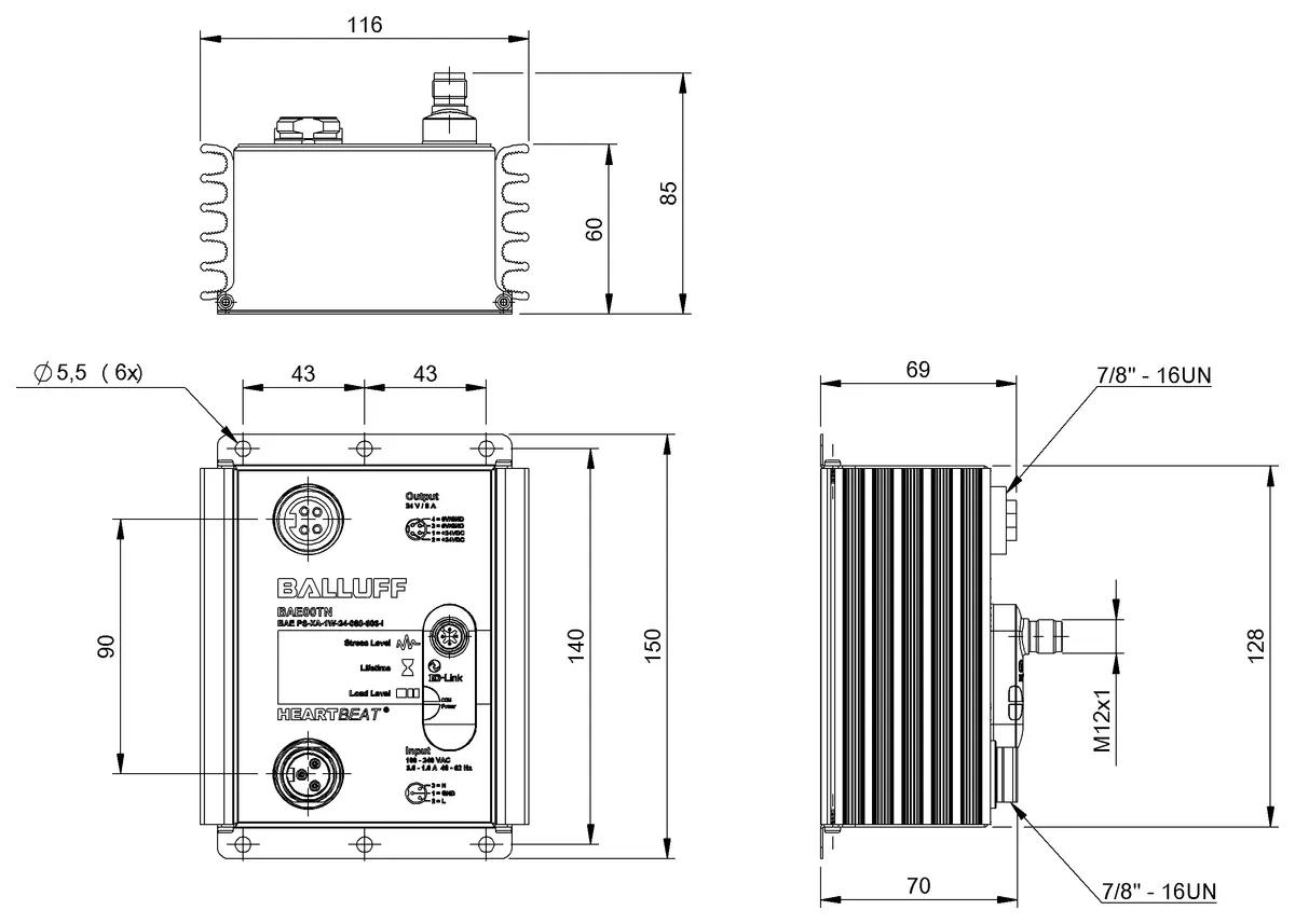 Dimension: 116 x 85 x 150 mm. Version: IP67. Mounting part: Flange mounting. Housing material: AluminiumPC. Connection (supply voltage IN): 7/8″-Male. Connection (supply voltage OUT): 7/8″-Female. Input voltage: 100…240 V AC, 1-phase. Rated output voltage DC: 24 V. Rated output current: 8 A. Output capacity max.: 192 W. Output current max.: 12 A for max. 4s. IP rating: IP67, with connector. Approval/Conformity: CEcULusWEEEUKCA. Ambient temperature: -25…70 °C