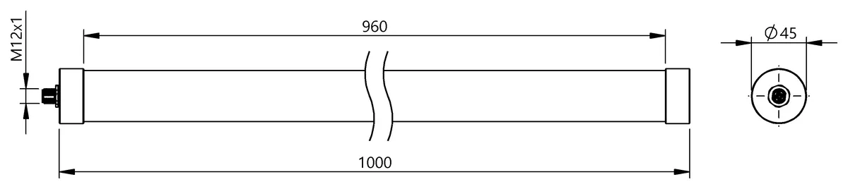 Connection: Connector, M12x1-Male, 4-pin. Version: Machine light. Dimension: Ø 45 x 1000 mm. Rated operating voltage Ue DC: 24 V. Material: Aluminium AnodizedBorosilicate crown glass. Illumination area: 960 x 42 mm. Beam angle: 120 °. Light type: LED white light diffuse. Light intensity: 3700 lm. Color temperature: 5000 K. Ambient temperature: -20…40 °C. Approval/Conformity: CEUKCAcULusWEEE. IP rating: IP67