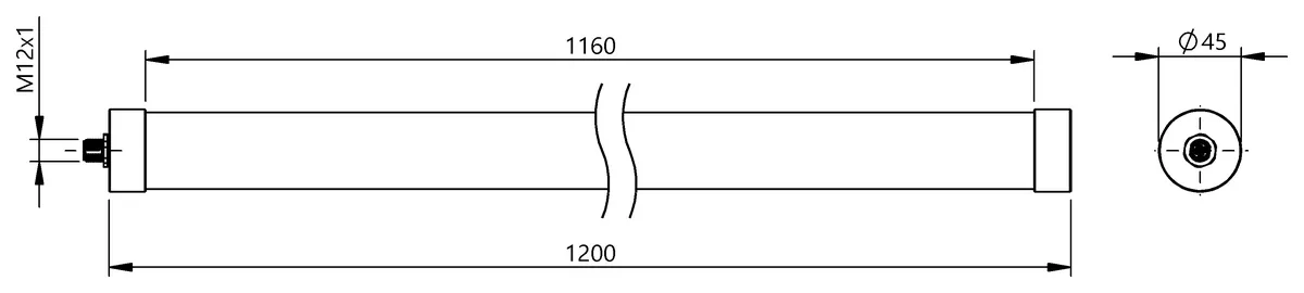 Connection: Connector, M12x1-Male, 4-pin. Version: Machine light. Dimension: Ø 45 x 1200 mm. Rated operating voltage Ue DC: 24 V. Material: Aluminium AnodizedBorosilicate crown glass. Illumination area: 1160 x 42 mm. Beam angle: 120 °. Light type: LED white light diffuse. Light intensity: 4400 lm. Color temperature: 5000 K. Ambient temperature: -20…40 °C. Approval/Conformity: CEUKCAcULusWEEE. IP rating: IP67