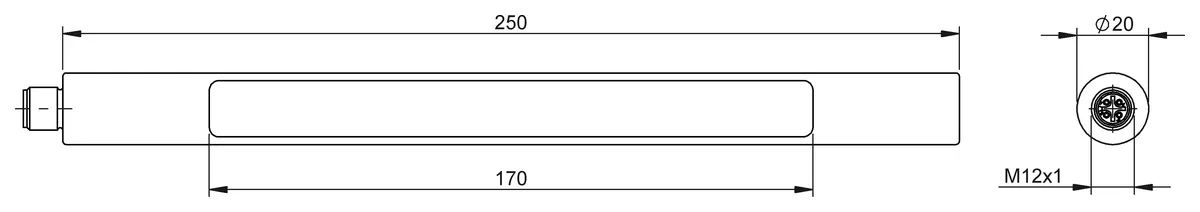 Connection: Connector, M12x1-Male. Version: Machine light. Dimension: Ø 20 x 250 mm. Rated operating voltage Ue DC: 24 V. Material: Aluminium anodized, naturalAcryl glass. Illumination area: 170 x 16…