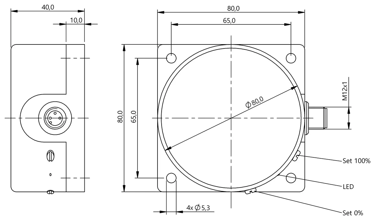 Dimension: 80 x 40 x 80 mm. Style Housing: block style. Installation: non-flush. Range: 0…50 mm. Analog output: Analog, voltage 0…10 V. Output characteristic: falling on approach. Limit frequency…