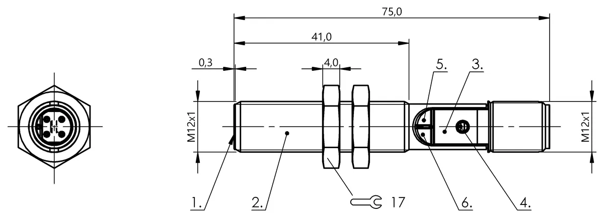 Dimension: Ø 12 x 75 mm. Series: M12. Thread (A): M12x1. Installation: for flush mounting. Connection: Connector, M12x1-Male, 3-pin. Switching output: PNP normally open (NO). Switching frequency: 100 Hz. Range: 1…4 mm. Sensitivity: Switching distance adjustable. Housing material: 1.4305 stainless steel. Material sensing surface: PBT. Ambient temperature: -25…85 °C. Operating voltage Ub: 10…30 VDC. Approval/Conformity: CEUKCAcULusWEEE. IP rating: IP67