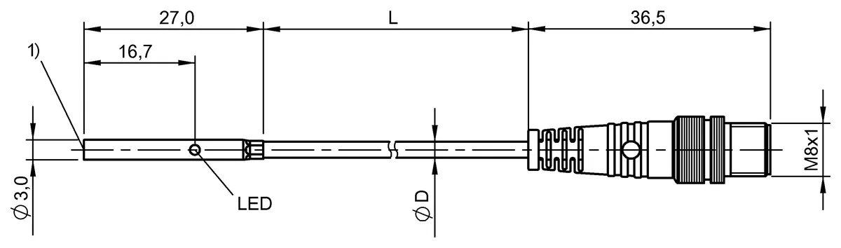 Dimension: Ø 3 x 27 mm. Style Housing: D3.0. Installation: for flush mounting. Range: 1 mm. Switching output: PNP normally open (NO). Switching frequency: 3500 Hz. Housing material: Stainless steel. Material sensing surface: PBT. Connection: Cable with connector, M8x1-Male, 3-pin, 0.30 m, PUR. Operating voltage Ub: 10…30 VDC. Ambient temperature: -25…70 °C. IP rating: IP67. Approval/Conformity: cULusCEUKCAWEEE