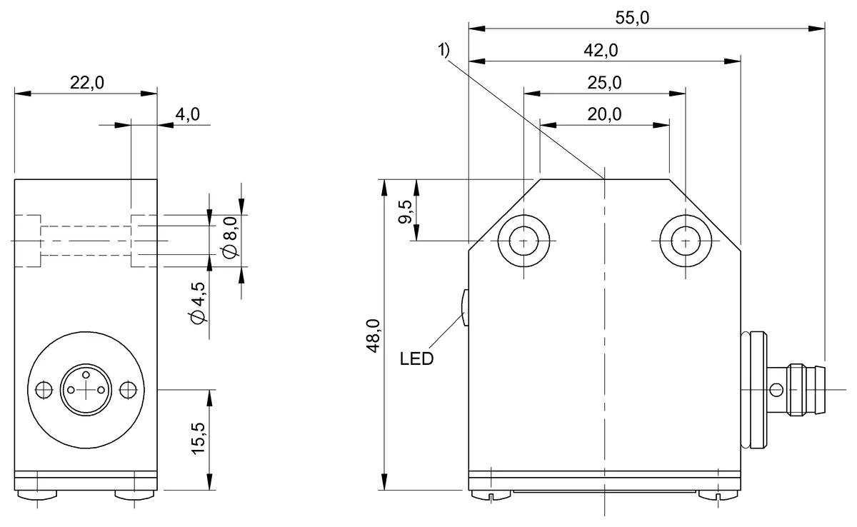 Dimension: 55 x 22 x 48 mm. Housing material: Aluminium, Anodized. Version: Inductive. Range: 5 mm. Switching frequency: 1. Switch position: 500 Hz. Installation: for flush mounting. Connection type: 1. Switch position: Connector. Ambient temperature: -25…70 °C. IP rating: IP67. Approval/Conformity: CEUKCAWEEE
