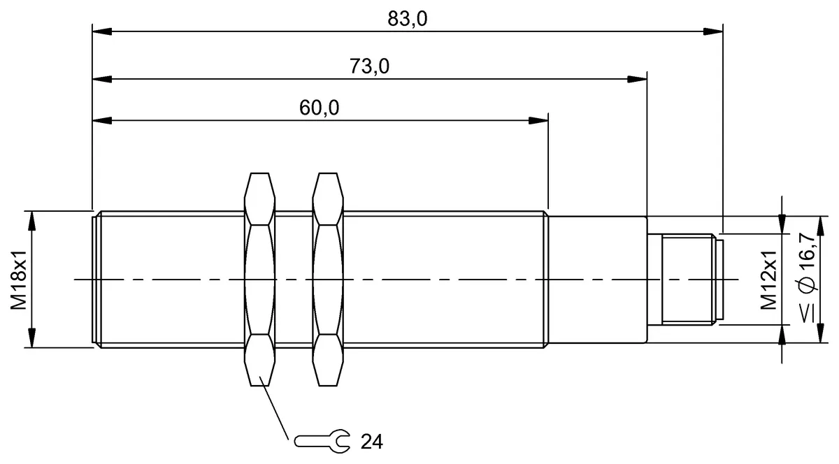 Dimension: Ø 18 x 83 mm. Style Housing: M18x1. Installation: for flush mounting. Range: 5 mm. Switching output: PNP normally open/normally closed (NO/NC). Switching frequency: 500 Hz. Housing material: Brass, nickel-plated. Material sensing surface: PBT. Connection: Connector, M12x1-Male, 4-pin. Operating voltage Ub: 10…30 VDC. Ambient temperature: -25…120 °C. IP rating: IP67. Approval/Conformity: CEUKCAWEEE