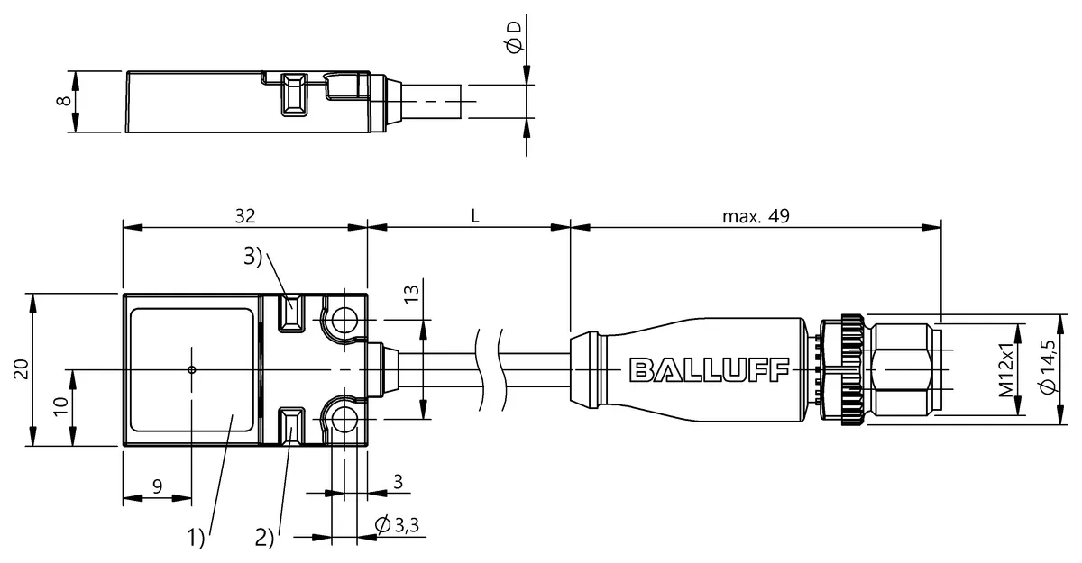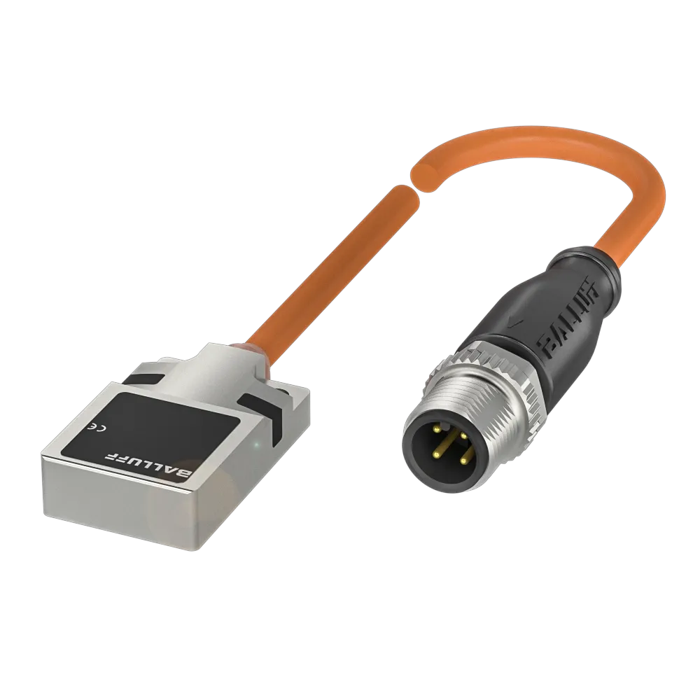 Dimension: 32 x 20 x 8 mm. Style Housing: 32x20x8. Installation: for flush mounting. Range: 7 mm. Switching output: PNP normally open (NO). Switching frequency: 150 Hz. Housing material: Zinc, Die casting, partly coated. Material sensing surface: ceramic coated. Connection: Cable with connector, M12x1-Male, 4-pin, 0.20 m, TPU. Operating voltage Ub: 10…30 VDC. Ambient temperature: -25…70 °C. IP rating: IP67. Approval/Conformity: CEUKCAcULusWEEE. Additional features: Housing resistant to weld spatter