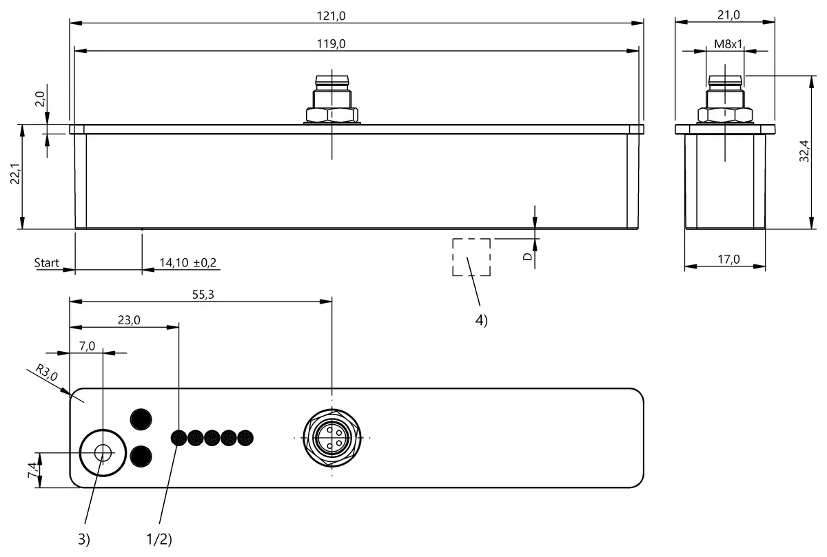 Dimension: 121 x 21 x 22 mm. Style Housing: block style. Connection: Connector, M8x1-Male, 4-pin. Housing material: PBT. Measuring range: 0…103 mm. Analog output: Analog, voltage 0…10 V Analog, cu…