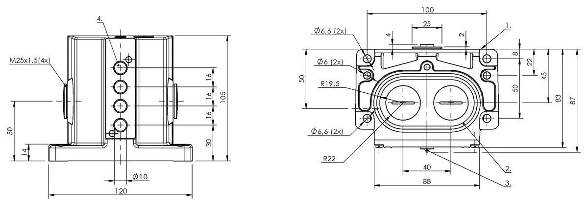 Dimension: 120 x 105 x 87 mm. Housing material: Aluminium, Anodized. Version: Inductive. Operating principle: 1-4. Switch position: Inductive. Range: 2 mm. Switching frequency: 1-4. Switch position: 1…