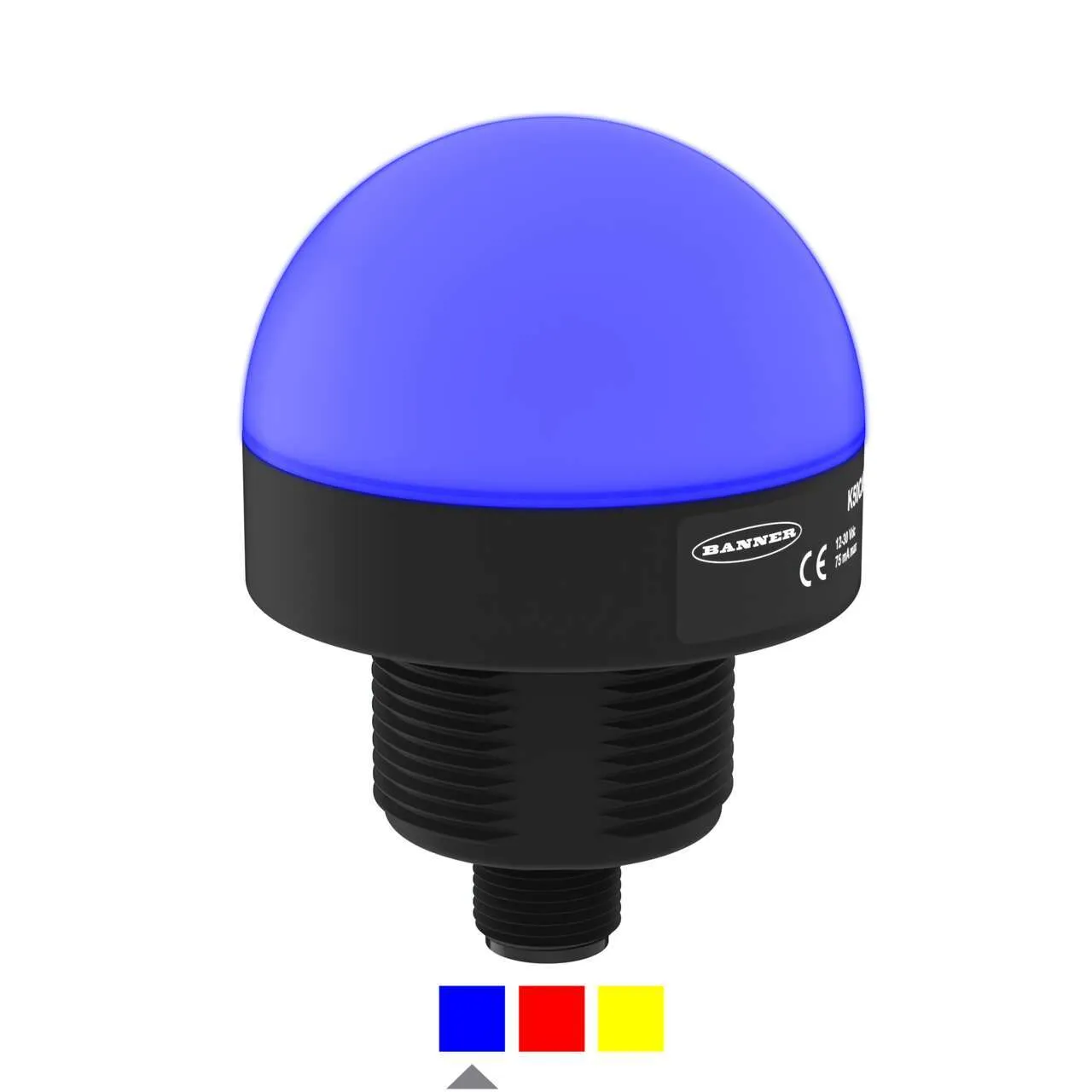 K50 Standard Series Indicator: 3-Color General Purpose Indicator. Part number: 818353. model: K50BRYPQ. part_number: 818353. list_price: 75 USD. is_new: 1. is_in_stock: 1. product_manual: https://info.bannerengineering.com/cs/groups/public/documents/literature/250281.pdf. BAN_Programmable: No. BAN_LI_DeviceType: Indicator. BAN_Encapsulated: No. BAN_IPRating: IP66, IP67, IP69K. Custom_Group_2026_2026: —. BAN_Housing_Style: Dome. BAN_Audible: No. BAN_Connection: Integral QD. BAN_Display: No. BAN_LI_Max_Sensing_Range: —. BAN_Vibration_Feedback: —. BAN_CableLength: —. BAN_Hazardous_Area: —. BAN_Primary_Housing_Material: Polycarbonate. BAN_Power: DC. BAN_Supply_Voltage: 24 V dc. Custom_Group_2027_2027: Colors: BlueColors: RedColors: Yellow. Power: DC. PFM Input: No. Non-Illuminated: No. IP Rating: IP66, IP67, IP69K. Display: No. NEMA / UL Type Rating: UL 4X, 13. Supply Voltage: 24 V dc. Lighting Device Type: Indicator. Discrete: No. Programmable: No. Item Status: RELEASED. Housing Style: Dome. Primary Housing Material: Polycarbonate. Indication: Yes. Illumination: No. Mounting Thread: M30 x 1.5. Color Input Control: Individual (One wire/color, same number of colors as input wires). Number of Colors: 3. Product Size (mm): 50. Color Technology: Standard LED. Color Option 1: Blue. Animation Option 1: Solid On. Connection: Integral QD. Lumens Color 1: 3.5. Quick Disconnect Type: M12. Color 1 – Wavelength/Color Temp/Coordinates: 466 nm. Color Option 2: Red. Animation Option 2: Solid On. Lumens Color 2: 11. Color 2 – Wavelength/Color Temp/Coordinates: 620 nm. Color Option 3: Yellow. Animation Option 3: Solid On. Lumens Color 3: 26. Color 3 – Wavelength/Color Temp/Coordinates: 589 nm. Max Current Color (mA): 55. Number of Input Pins/Conductors: 4. Input Type: PNP. I/O Block Compatible: No. Max Input Response Time (ms): 1. Physical Dimensions (LxWxH or DxH mm): 50.0 x 69.0. Eye Shield: No. High Temperature (up to 100 C): 50. Min Op. Temperature (C): -40. Primary Housing Color: Black. Primary Window Material: Polycarbonate Diffused. Feature: Washdown Rated: Yes. Feature: Encapsulated: No. Feature: Audible: No. Feature: Cascade: No. Feature: Chemical Resistant: No. Multi-Color Device: Single Color On. Application: Traffic Light: No. Feature: Quick Disconnect: Yes. IO Link: No. Modbus RTU: No. Wireless: No. USB: No. Pro-Editor Compatible (Discrete): No