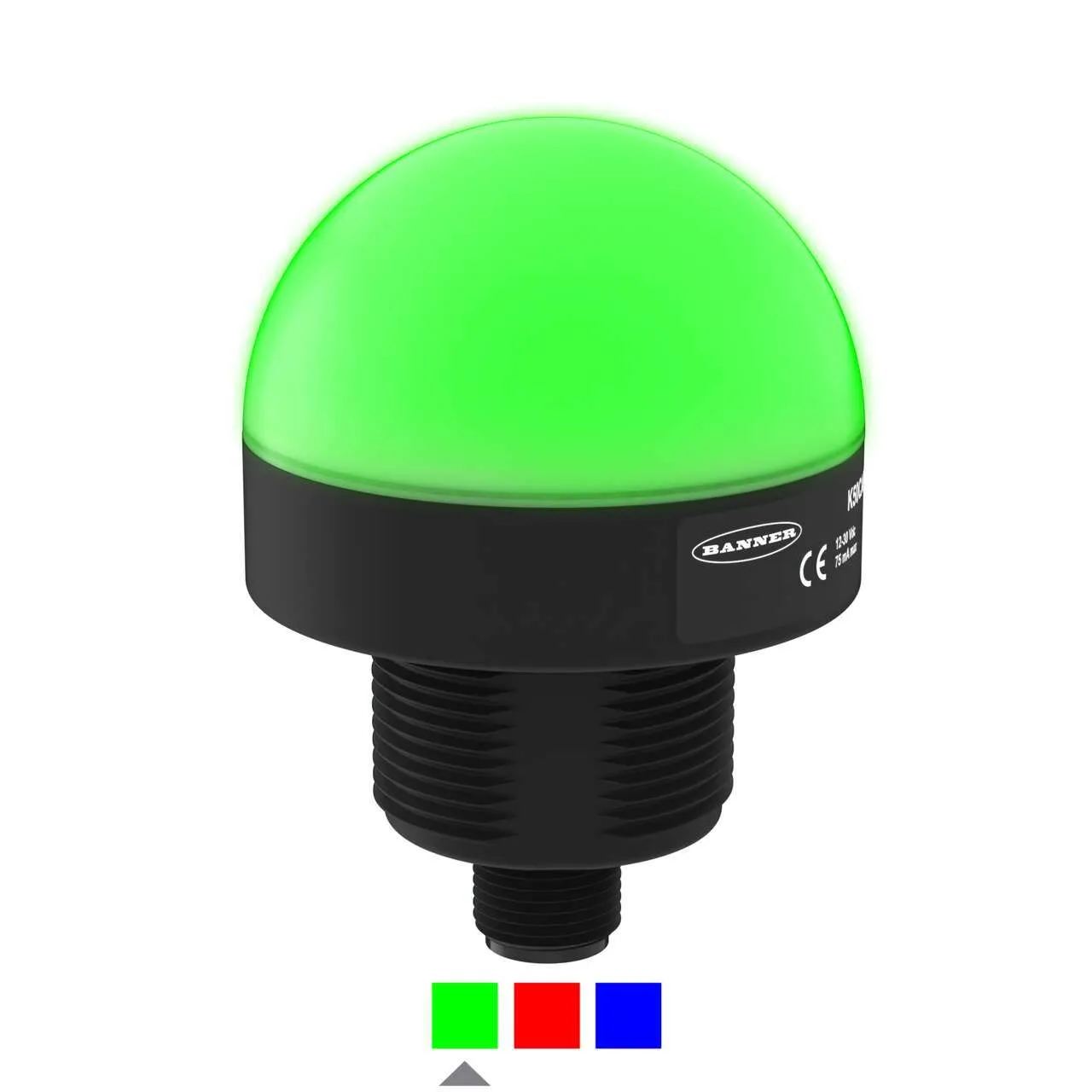 K50 Standard Series Indicator: 3-Color General Purpose Indicator. Part number: 818354. model: K50GRBPQ. part_number: 818354. list_price: 75 USD. is_new: 1. is_in_stock: 1. product_manual: https://info.bannerengineering.com/cs/groups/public/documents/literature/250281.pdf. BAN_Programmable: No. BAN_LI_DeviceType: Indicator. BAN_Encapsulated: No. BAN_IPRating: IP66, IP67, IP69K. Custom_Group_2026_2026: —. BAN_Housing_Style: Dome. BAN_Audible: No. BAN_Connection: Integral QD. BAN_Display: No. BAN_LI_Max_Sensing_Range: —. BAN_Vibration_Feedback: —. BAN_CableLength: —. BAN_Hazardous_Area: —. BAN_Primary_Housing_Material: Polycarbonate. BAN_Power: DC. BAN_Supply_Voltage: 24 V dc. Custom_Group_2027_2027: Colors: GreenColors: RedColors: Blue. Power: DC. PFM Input: No. Non-Illuminated: No. IP Rating: IP66, IP67, IP69K. Display: No. NEMA / UL Type Rating: UL 4X, 13. Supply Voltage: 24 V dc. Lighting Device Type: Indicator. Discrete: No. Programmable: No. Item Status: RELEASED. Housing Style: Dome. Primary Housing Material: Polycarbonate. Indication: Yes. Illumination: No. Mounting Thread: M30 x 1.5. Color Input Control: Individual (One wire/color, same number of colors as input wires). Number of Colors: 3. Product Size (mm): 50. Color Technology: Standard LED. Color Option 1: Green. Animation Option 1: Solid On. Connection: Integral QD. Lumens Color 1: 21. Quick Disconnect Type: M12. Color 1 – Wavelength/Color Temp/Coordinates: 522 nm. Color Option 2: Red. Animation Option 2: Solid On. Lumens Color 2: 11. Color 2 – Wavelength/Color Temp/Coordinates: 620 nm. Color Option 3: Blue. Animation Option 3: Solid On. Lumens Color 3: 3.5. Color 3 – Wavelength/Color Temp/Coordinates: 466 nm. Max Current Color (mA): 55. Number of Input Pins/Conductors: 4. Input Type: PNP. I/O Block Compatible: No. Max Input Response Time (ms): 1. Physical Dimensions (LxWxH or DxH mm): 50.0 x 69.0. Eye Shield: No. High Temperature (up to 100 C): 50. Min Op. Temperature (C): -40. Primary Housing Color: Black. Primary Window Material: Polycarbonate Diffused. Feature: Washdown Rated: Yes. Feature: Encapsulated: No. Feature: Audible: No. Feature: Cascade: No. Feature: Chemical Resistant: No. Multi-Color Device: Single Color On. Application: Traffic Light: No. Feature: Quick Disconnect: Yes. IO Link: No. Modbus RTU: No. Wireless: No. USB: No. Pro-Editor Compatible (Discrete): No