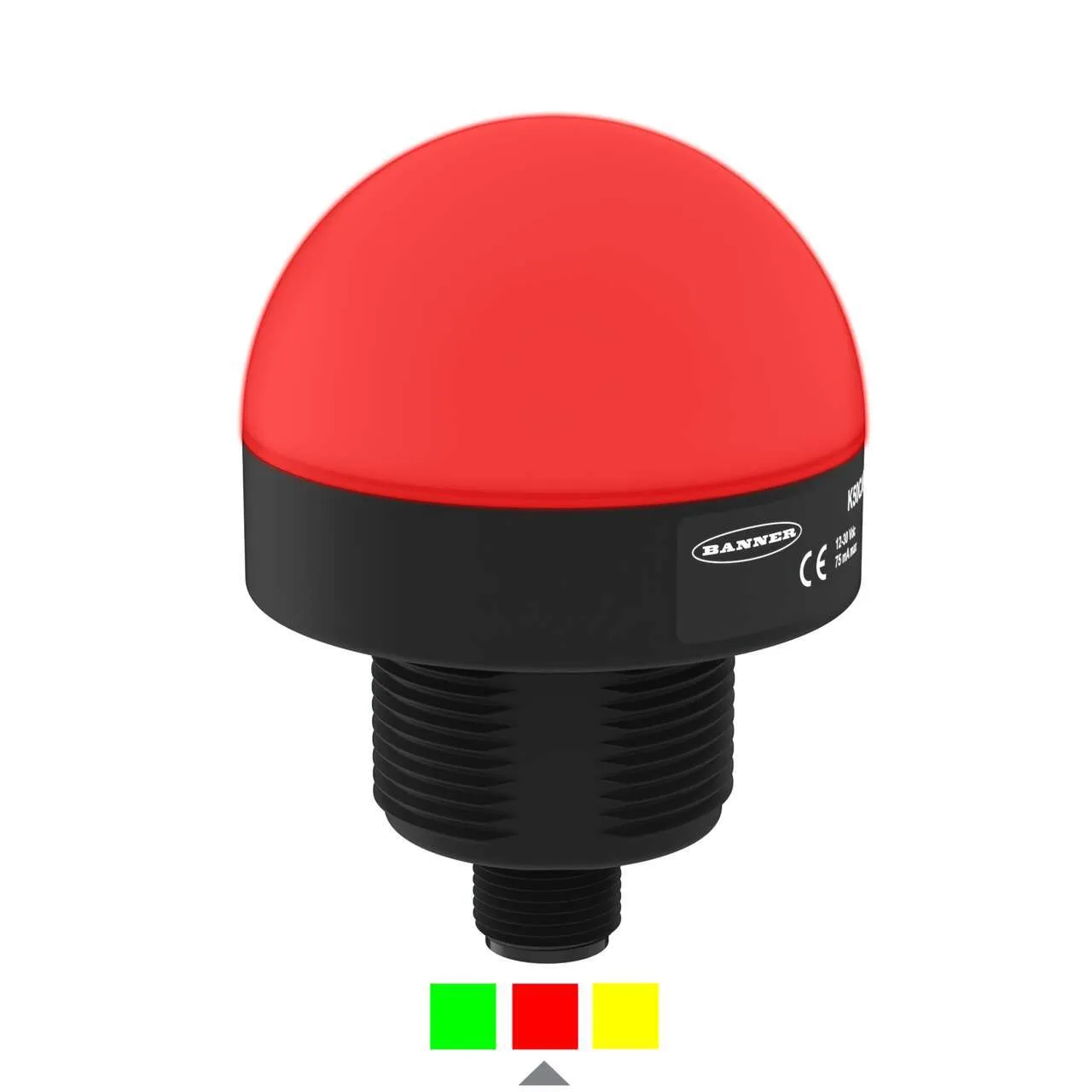 K50 Standard Series Indicator: 3-Color General Purpose Indicator. Part number: 818352. model: K50GRYPQ. part_number: 818352. list_price: 75 USD. is_new: 1. is_in_stock: 0. product_manual: https://info.bannerengineering.com/cs/groups/public/documents/literature/250281.pdf. BAN_Programmable: No. BAN_LI_DeviceType: Indicator. BAN_Encapsulated: No. BAN_IPRating: IP66, IP67, IP69K. Custom_Group_2026_2026: —. BAN_Housing_Style: Dome. BAN_Audible: No. BAN_Connection: Integral QD. BAN_Display: No. BAN_LI_Max_Sensing_Range: —. BAN_Vibration_Feedback: —. BAN_CableLength: —. BAN_Hazardous_Area: —. BAN_Primary_Housing_Material: Polycarbonate. BAN_Power: DC. BAN_Supply_Voltage: 24 V dc. Custom_Group_2027_2027: Colors: GreenColors: RedColors: Yellow. Power: DC. PFM Input: No. Non-Illuminated: No. IP Rating: IP66, IP67, IP69K. Display: No. NEMA / UL Type Rating: UL 4X, 13. Supply Voltage: 24 V dc. Lighting Device Type: Indicator. Discrete: No. Programmable: No. Item Status: RELEASED. Housing Style: Dome. Primary Housing Material: Polycarbonate. Indication: Yes. Illumination: No. Mounting Thread: M30 x 1.5. Color Input Control: Individual (One wire/color, same number of colors as input wires). Number of Colors: 3. Product Size (mm): 50. Color Technology: Standard LED. Color Option 1: Green. Animation Option 1: Solid On. Connection: Integral QD. Lumens Color 1: 21. Quick Disconnect Type: M12. Color 1 – Wavelength/Color Temp/Coordinates: 522 nm. Color Option 2: Red. Animation Option 2: Solid On. Lumens Color 2: 11. Color 2 – Wavelength/Color Temp/Coordinates: 620 nm. Color Option 3: Yellow. Animation Option 3: Solid On. Lumens Color 3: 26. Color 3 – Wavelength/Color Temp/Coordinates: 589 nm. Max Current Color (mA): 55. Number of Input Pins/Conductors: 4. Input Type: PNP. I/O Block Compatible: No. Max Input Response Time (ms): 1. Physical Dimensions (LxWxH or DxH mm): 50.0 x 69.0. Eye Shield: No. High Temperature (up to 100 C): 50. Min Op. Temperature (C): -40. Primary Housing Color: Black. Primary Window Material: Polycarbonate Diffused. Feature: Washdown Rated: Yes. Feature: Encapsulated: No. Feature: Audible: No. Feature: Cascade: No. Feature: Chemical Resistant: No. Multi-Color Device: Single Color On. Application: Traffic Light: No. Feature: Quick Disconnect: Yes. IO Link: No. Modbus RTU: No. Wireless: No. USB: No. Pro-Editor Compatible (Discrete): No