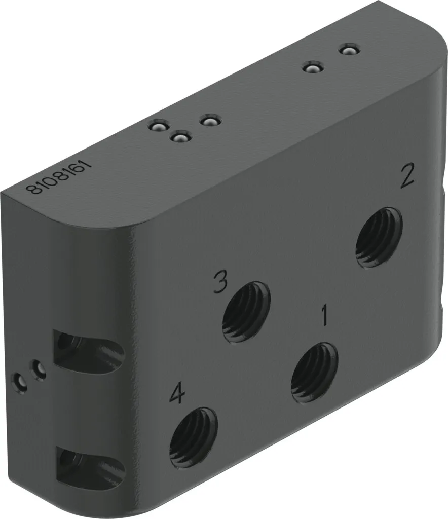 Prepared for positioner CMSH-V-SD with the mechanical interface for the sub-base version and switchable with mode of operation in the single-acting/double-acting version , Determines the operating mode of the positioner CMSH-V-SD , Variants with mechanical interface to VDI/VDE 3845 or to VDI/VDE 3847-2 , Variants with or without pressure gauge connection , With safety functions