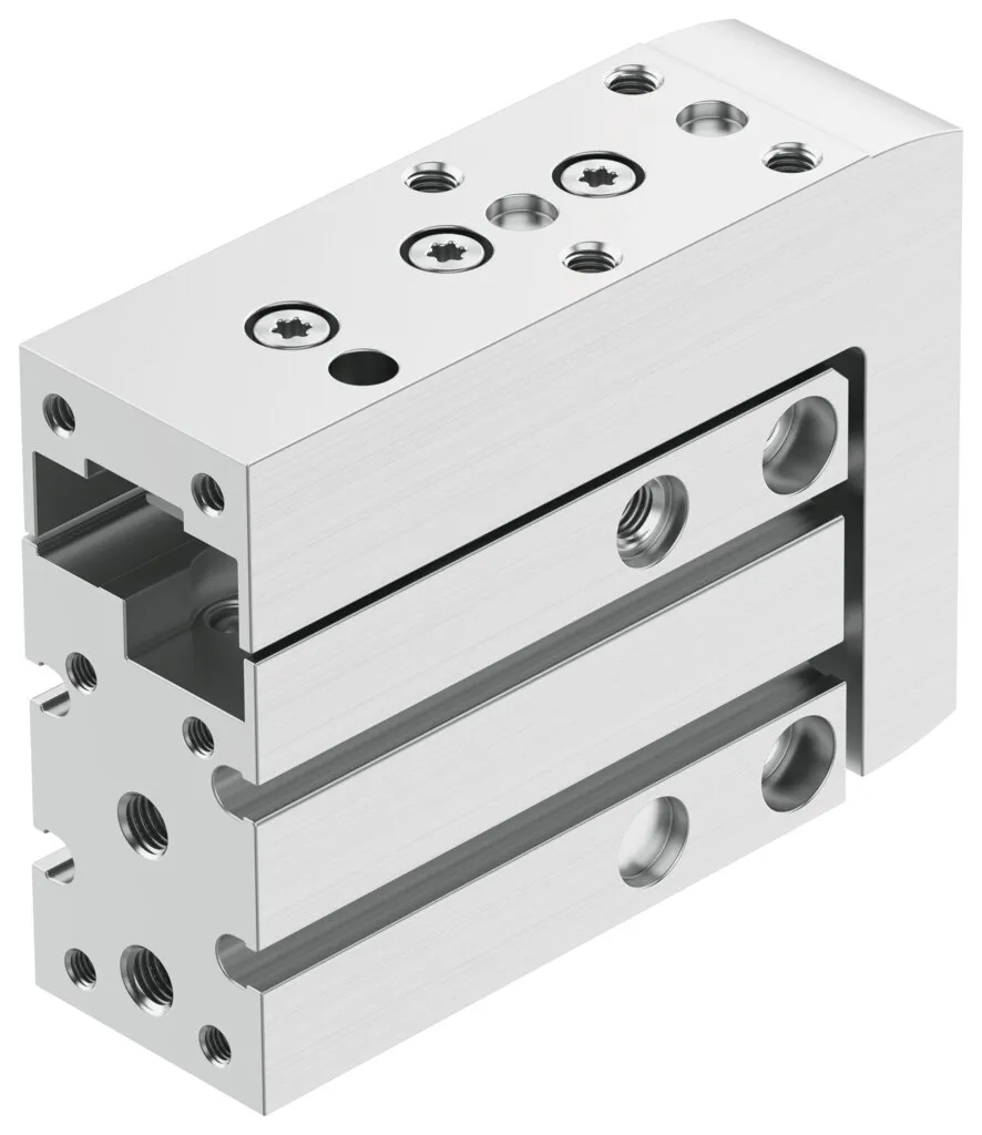 Slim design , Excellent positioning accuracy , Precise and resilient roller bearing guide , Optimum price/performance ratio , Slide and yoke plate from one component , Can be operated without additional cushioning elements , Optional: stroke adjustment and external cushioning using accessories , Recommended for production systems for manufacturing lithium-ion batteries