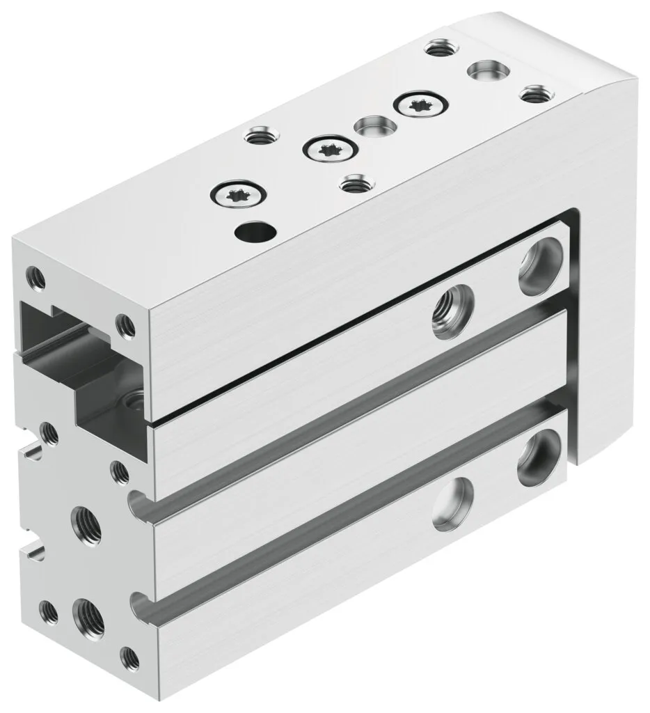 Slim design , Excellent positioning accuracy , Precise and resilient roller bearing guide , Optimum price/performance ratio , Slide and yoke plate from one component , Can be operated without additional cushioning elements , Optional: stroke adjustment and external cushioning using accessories , Recommended for production systems for manufacturing lithium-ion batteries