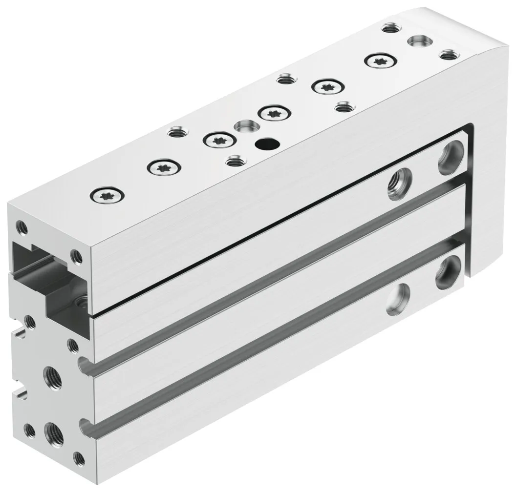 Slim design , Excellent positioning accuracy , Precise and resilient roller bearing guide , Optimum price/performance ratio , Slide and yoke plate from one component , Can be operated without additional cushioning elements , Optional: stroke adjustment and external cushioning using accessories , Recommended for production systems for manufacturing lithium-ion batteries