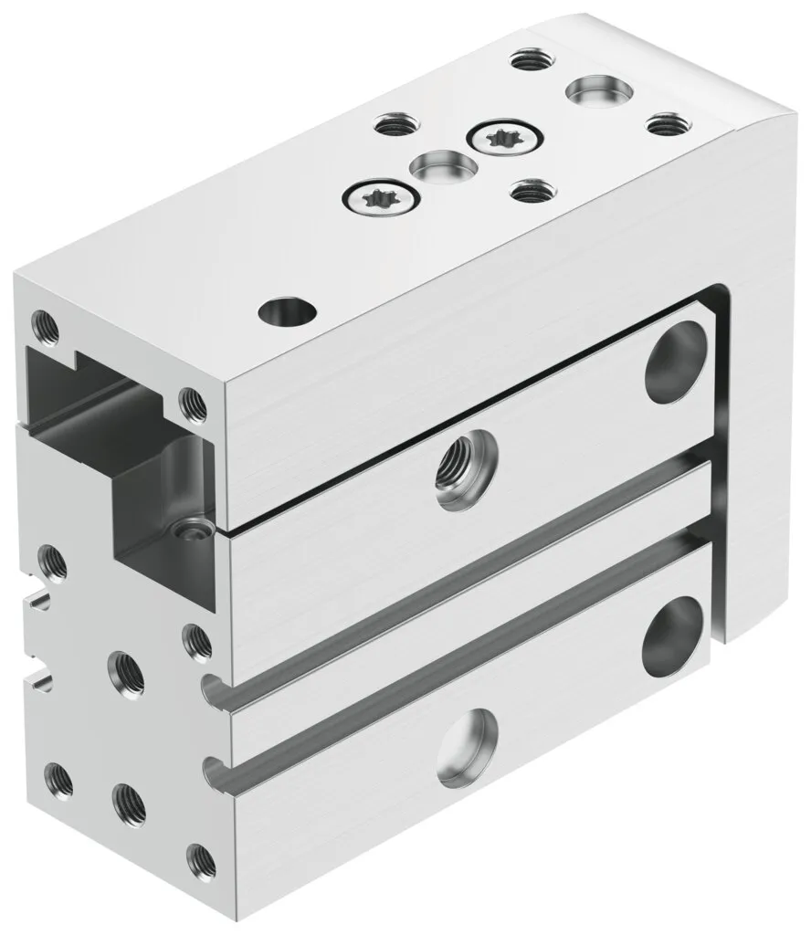 Slim design , Excellent positioning accuracy , Precise and resilient roller bearing guide , Optimum price/performance ratio , Slide and yoke plate from one component , Can be operated without additional cushioning elements , Optional: stroke adjustment and external cushioning using accessories , Recommended for production systems for manufacturing lithium-ion batteries