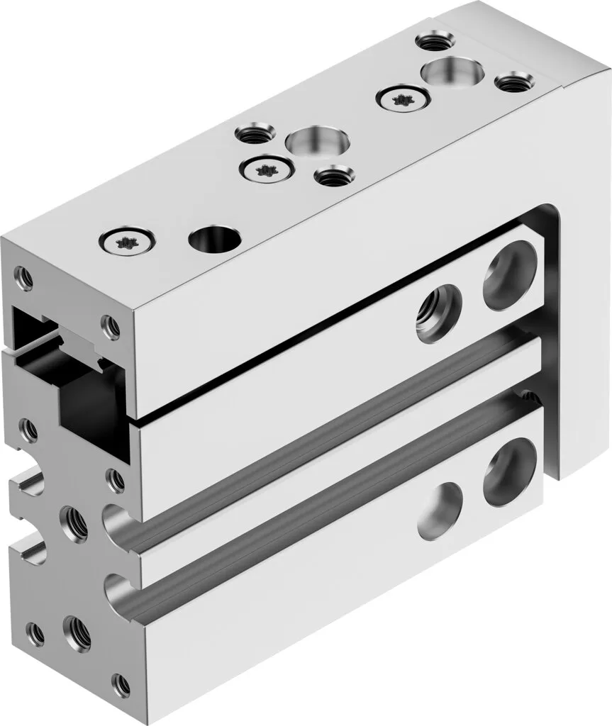 Slim design , Excellent positioning accuracy , Precise and resilient roller bearing guide , Optimum price/performance ratio , Slide and yoke plate from one component , Can be operated without additional cushioning elements , Optional: stroke adjustment and external cushioning using accessories , Recommended for production systems for manufacturing lithium-ion batteries