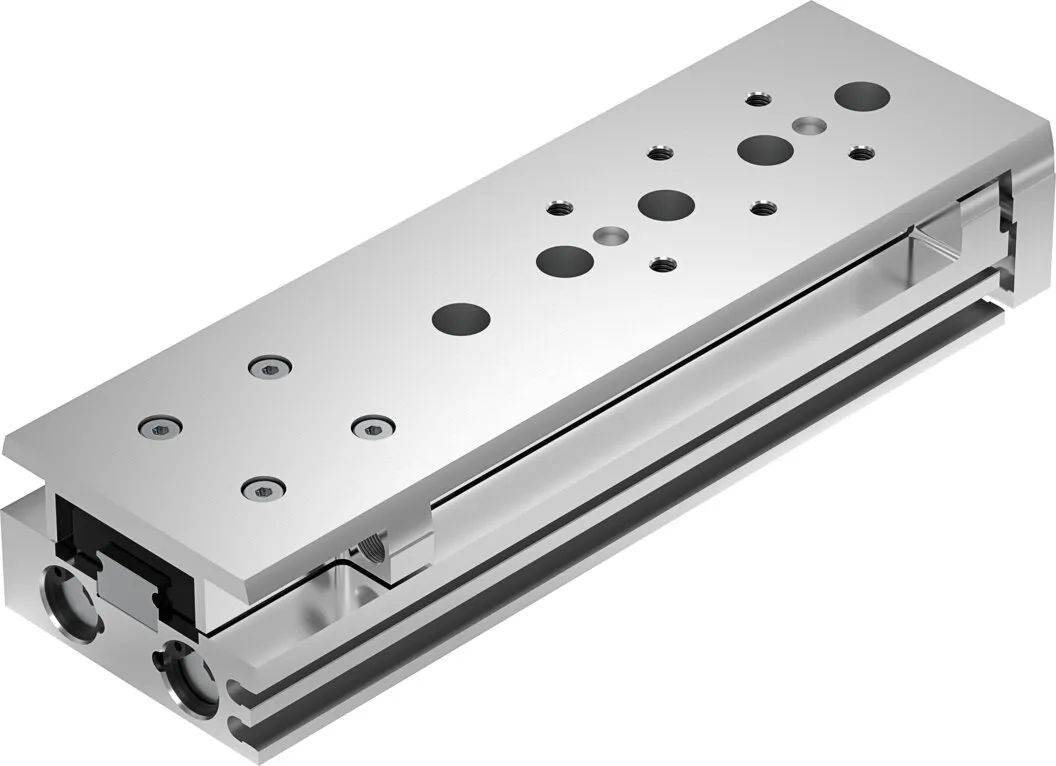 Powerful twin-piston drive , Shortest mini slide on the market , Precise recirculating ball bearing guide , Versatile mounting options , Version with mirrored supply port configuration and sensor slots for compact assembly available to order using the configurator , Variants recommended for production systems for manufacturing lithium-ion batteries , Sustainable in production thanks to reduced use of materials