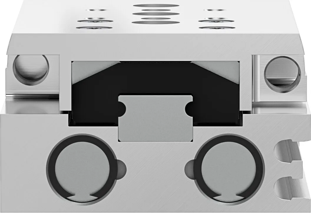 Powerful twin-piston drive , Shortest mini slide on the market , Precise recirculating ball bearing guide , Versatile mounting options , Version with mirrored supply port configuration and sensor slots for compact assembly available to order using the configurator , Variants recommended for production systems for manufacturing lithium-ion batteries , Sustainable in production thanks to reduced use of materials