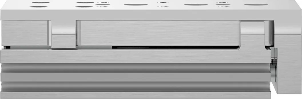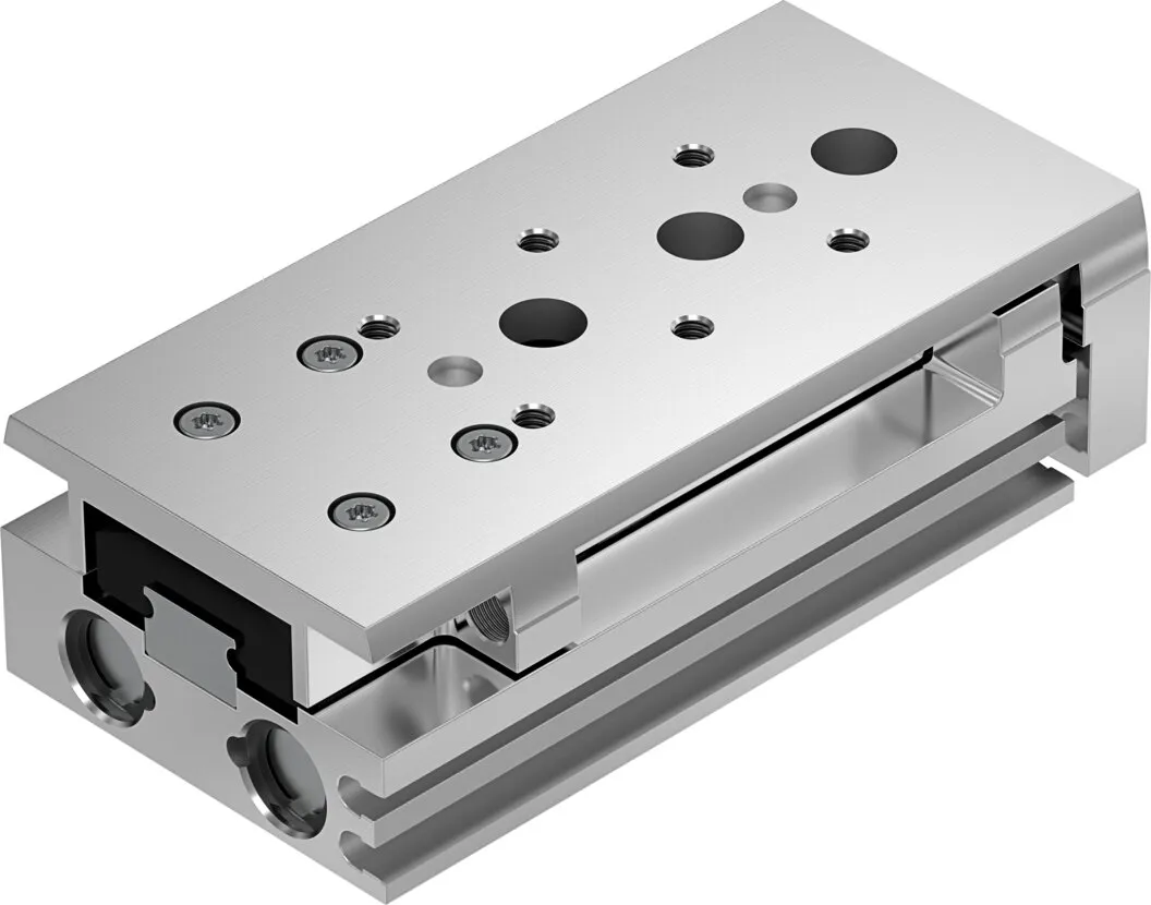 Powerful twin-piston drive , Shortest mini slide on the market , Precise recirculating ball bearing guide , Versatile mounting options , Version with mirrored supply port configuration and sensor slots for compact assembly available to order using the configurator , Variants recommended for production systems for manufacturing lithium-ion batteries , Sustainable in production thanks to reduced use of materials