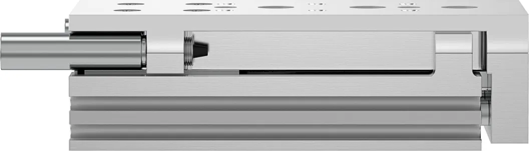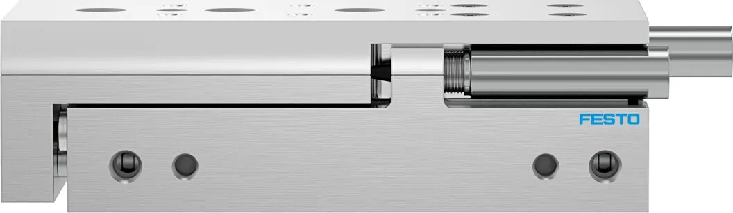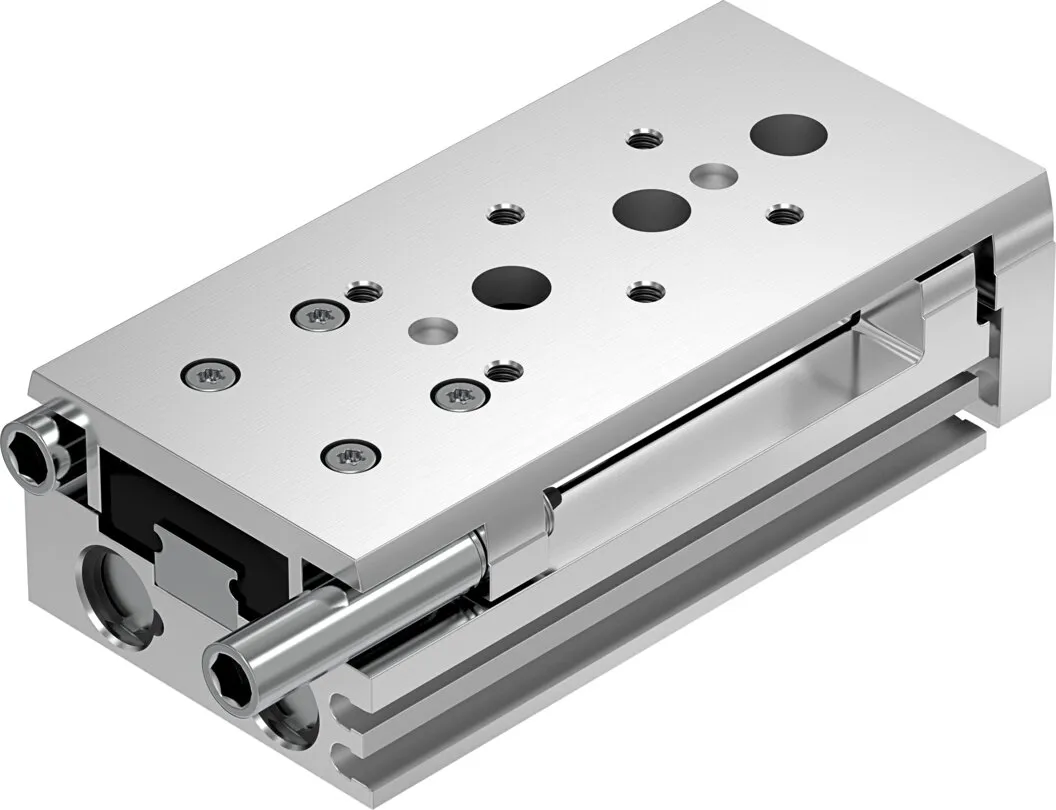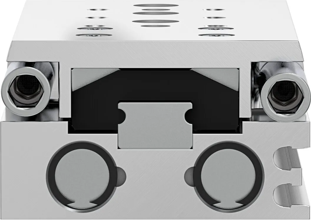 Powerful twin-piston drive , Shortest mini slide on the market , Precise recirculating ball bearing guide , Versatile mounting options , Version with mirrored supply port configuration and sensor slots for compact assembly available to order using the configurator , Variants recommended for production systems for manufacturing lithium-ion batteries , Sustainable in production thanks to reduced use of materials