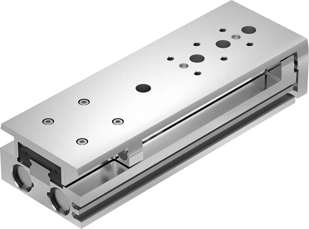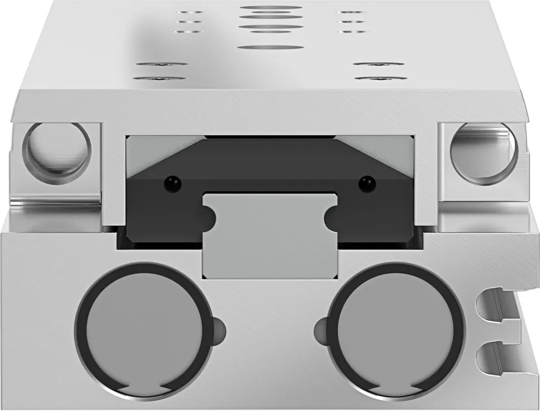 Powerful twin-piston drive , Shortest mini slide on the market , Precise recirculating ball bearing guide , Versatile mounting options , Version with mirrored supply port configuration and sensor slots for compact assembly available to order using the configurator , Variants recommended for production systems for manufacturing lithium-ion batteries , Sustainable in production thanks to reduced use of materials