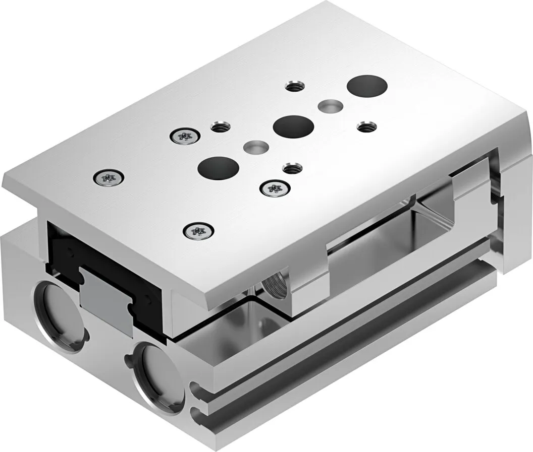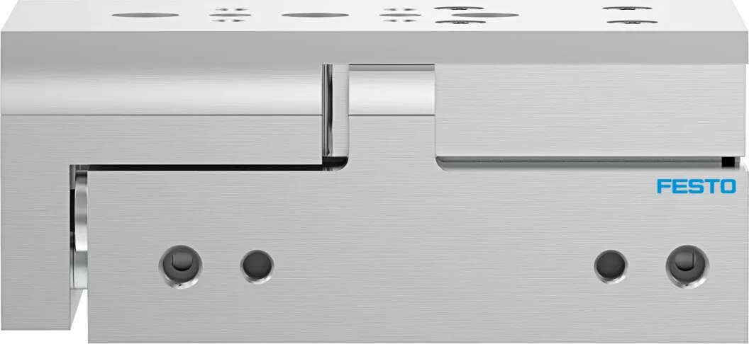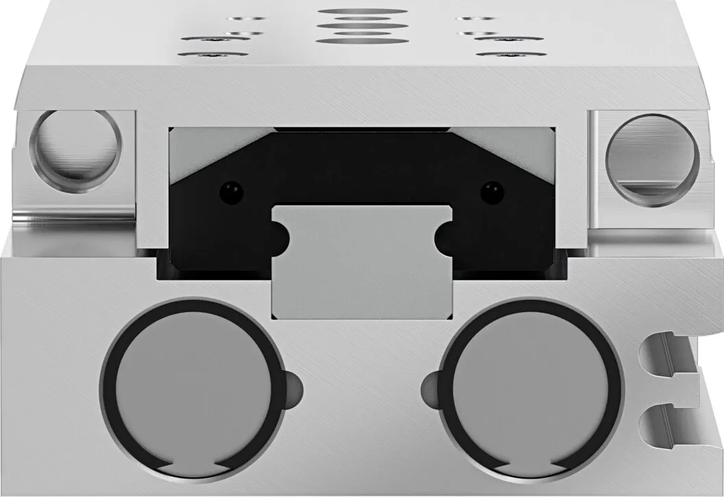 Powerful twin-piston drive , Shortest mini slide on the market , Precise recirculating ball bearing guide , Versatile mounting options , Version with mirrored supply port configuration and sensor slots for compact assembly available to order using the configurator , Variants recommended for production systems for manufacturing lithium-ion batteries , Sustainable in production thanks to reduced use of materials
