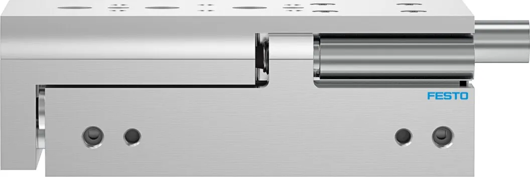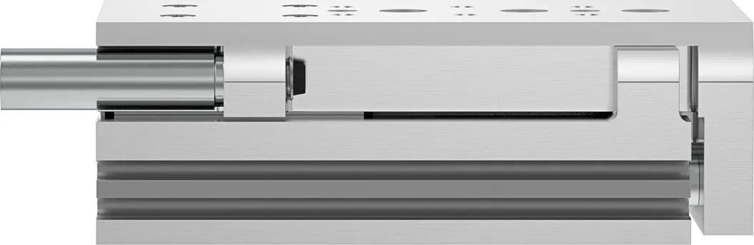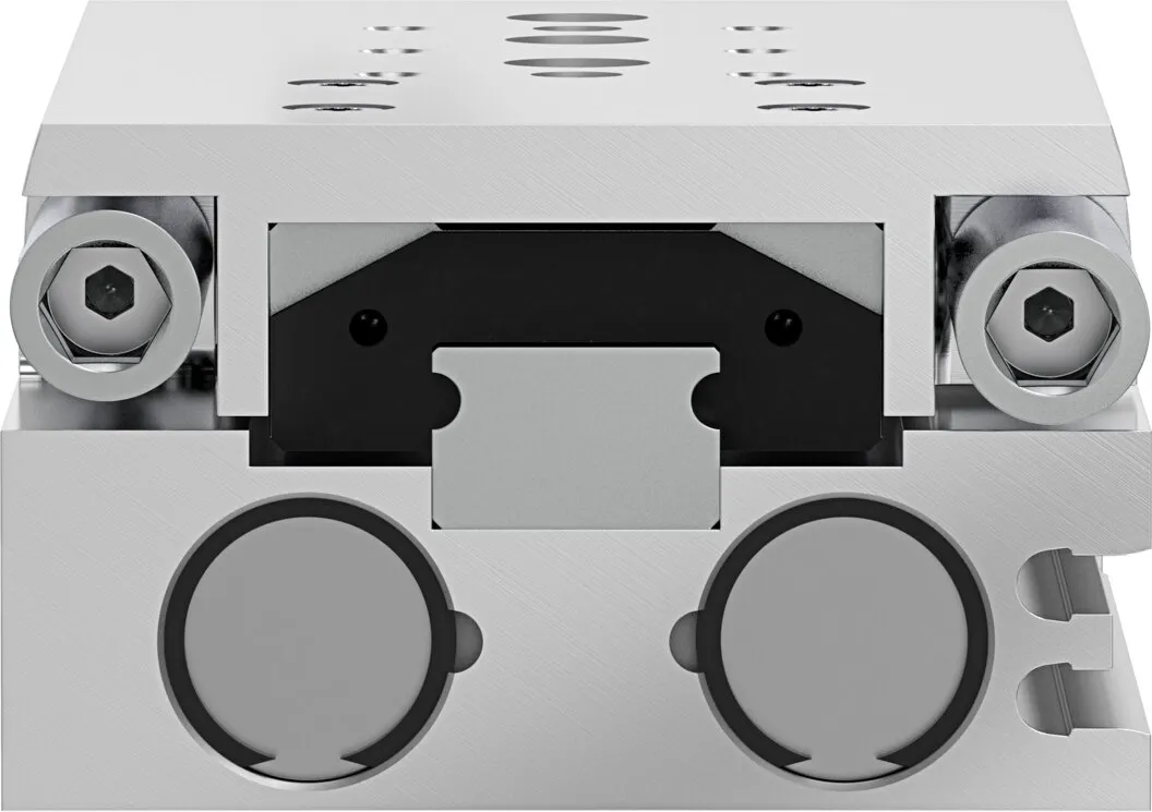Powerful twin-piston drive , Shortest mini slide on the market , Precise recirculating ball bearing guide , Versatile mounting options , Version with mirrored supply port configuration and sensor slots for compact assembly available to order using the configurator , Variants recommended for production systems for manufacturing lithium-ion batteries , Sustainable in production thanks to reduced use of materials