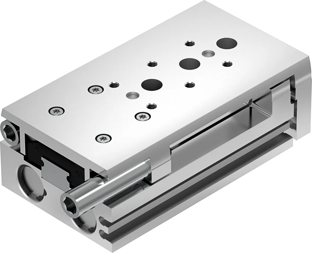Powerful twin-piston drive , Shortest mini slide on the market , Precise recirculating ball bearing guide , Versatile mounting options , Version with mirrored supply port configuration and sensor slots for compact assembly available to order using the configurator , Variants recommended for production systems for manufacturing lithium-ion batteries , Sustainable in production thanks to reduced use of materials