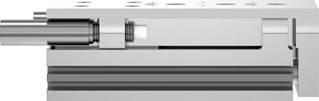 Powerful twin-piston drive , Shortest mini slide on the market , Precise recirculating ball bearing guide , Versatile mounting options , Version with mirrored supply port configuration and sensor slots for compact assembly available to order using the configurator , Variants recommended for production systems for manufacturing lithium-ion batteries , Sustainable in production thanks to reduced use of materials