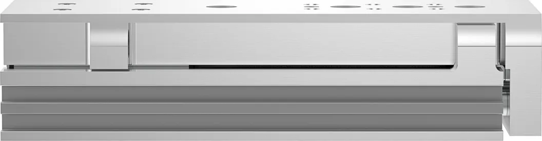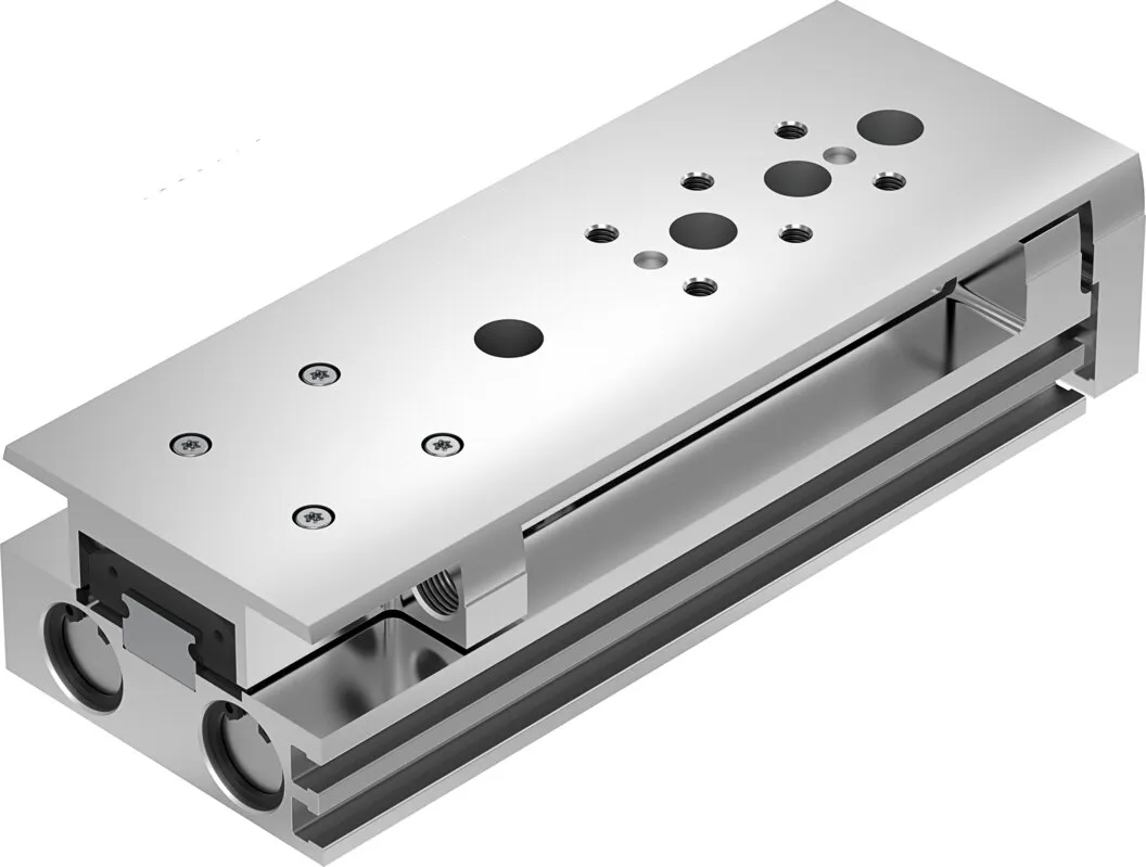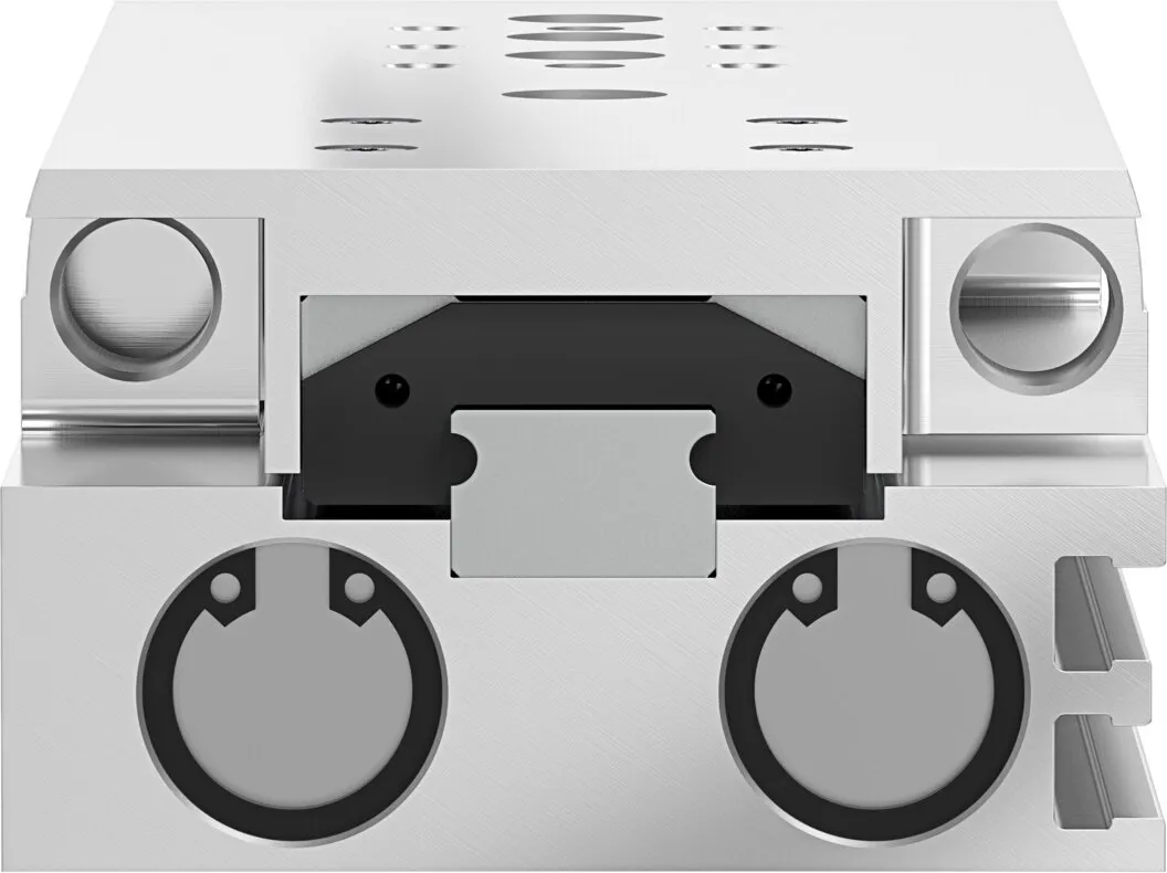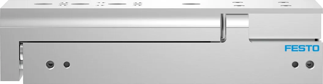 Powerful twin-piston drive , Shortest mini slide on the market , Precise recirculating ball bearing guide , Versatile mounting options , Version with mirrored supply port configuration and sensor slots for compact assembly available to order using the configurator , Variants recommended for production systems for manufacturing lithium-ion batteries , Sustainable in production thanks to reduced use of materials