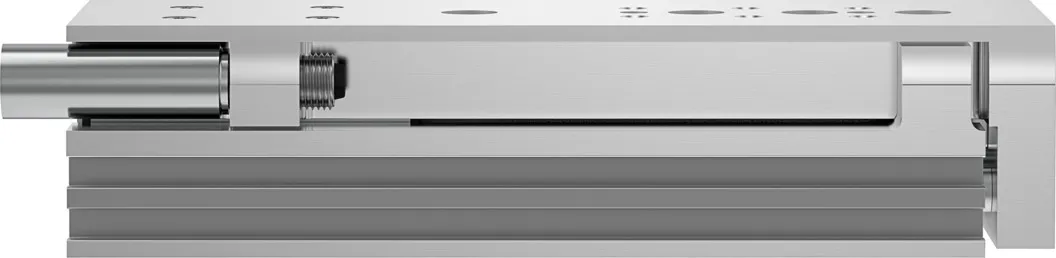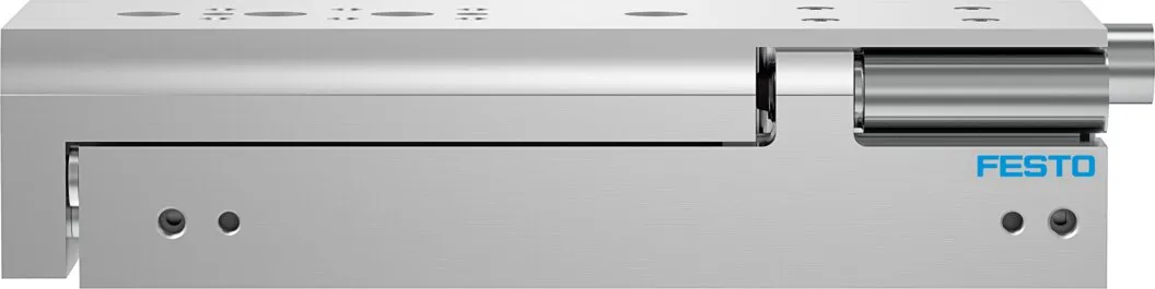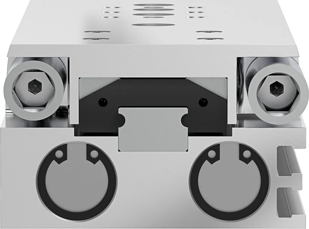 Powerful twin-piston drive , Shortest mini slide on the market , Precise recirculating ball bearing guide , Versatile mounting options , Version with mirrored supply port configuration and sensor slots for compact assembly available to order using the configurator , Variants recommended for production systems for manufacturing lithium-ion batteries , Sustainable in production thanks to reduced use of materials