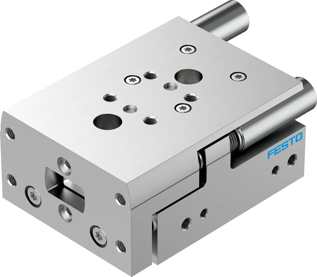 Powerful twin-piston drive , Shortest mini slide on the market , Precise recirculating ball bearing guide , Versatile mounting options , Version with mirrored supply port configuration and sensor slots for compact assembly available to order using the configurator , Variants recommended for production systems for manufacturing lithium-ion batteries , Sustainable in production thanks to reduced use of materials