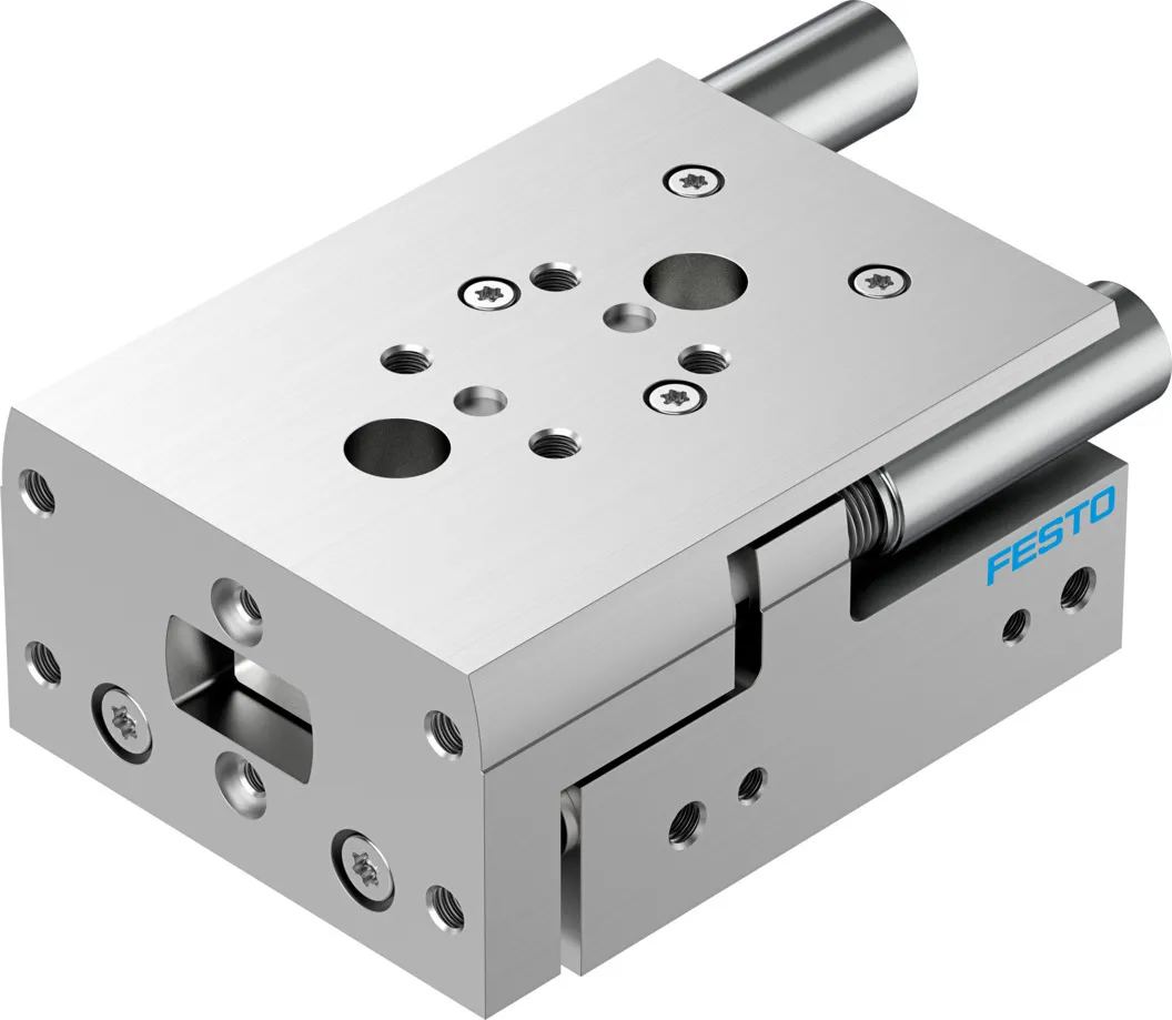 Powerful twin-piston drive , Shortest mini slide on the market , Precise recirculating ball bearing guide , Versatile mounting options , Version with mirrored supply port configuration and sensor slots for compact assembly available to order using the configurator , Variants recommended for production systems for manufacturing lithium-ion batteries , Sustainable in production thanks to reduced use of materials