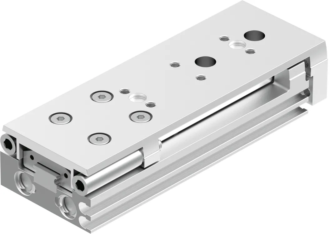 Powerful twin-piston drive , Shortest mini slide on the market , Precise recirculating ball bearing guide , Versatile mounting options , Version with mirrored supply port configuration and sensor slots for compact assembly available to order using the configurator , Variants recommended for production systems for manufacturing lithium-ion batteries , Sustainable in production thanks to reduced use of materials