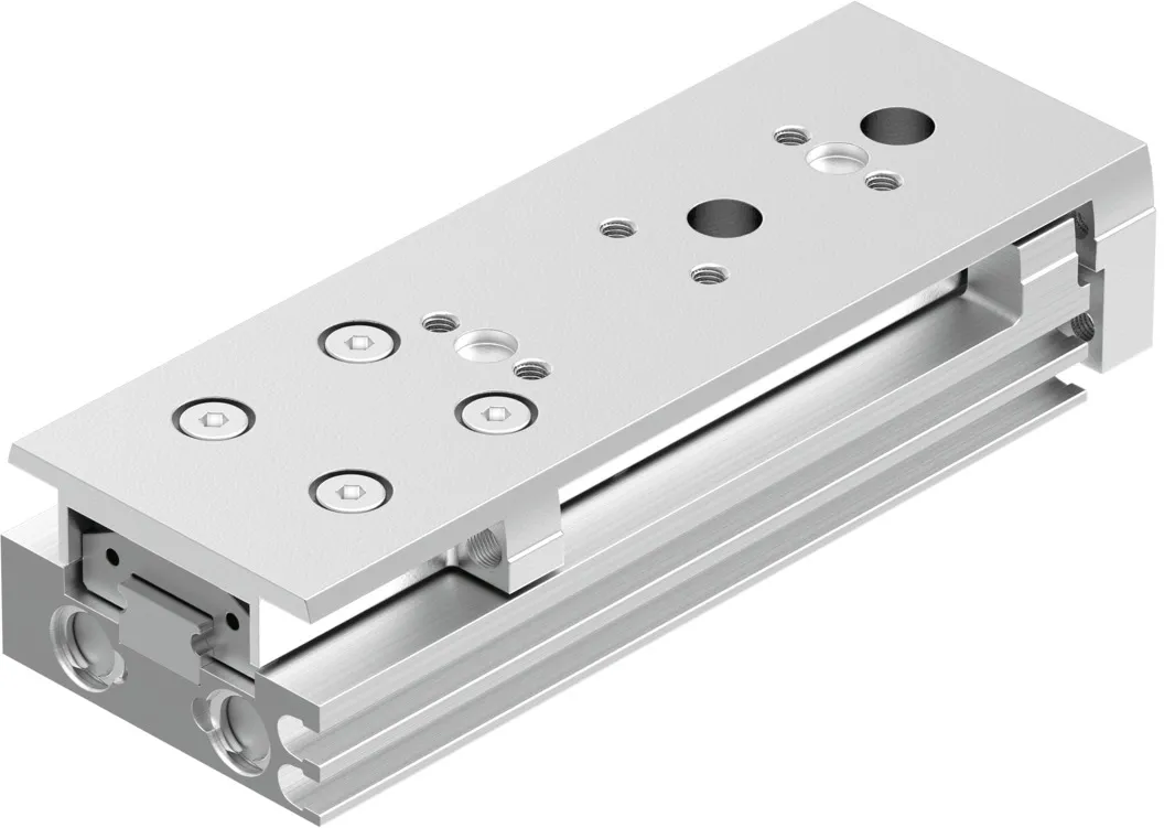 Powerful twin-piston drive , Shortest mini slide on the market , Precise recirculating ball bearing guide , Versatile mounting options , Version with mirrored supply port configuration and sensor slots for compact assembly available to order using the configurator , Variants recommended for production systems for manufacturing lithium-ion batteries , Sustainable in production thanks to reduced use of materials