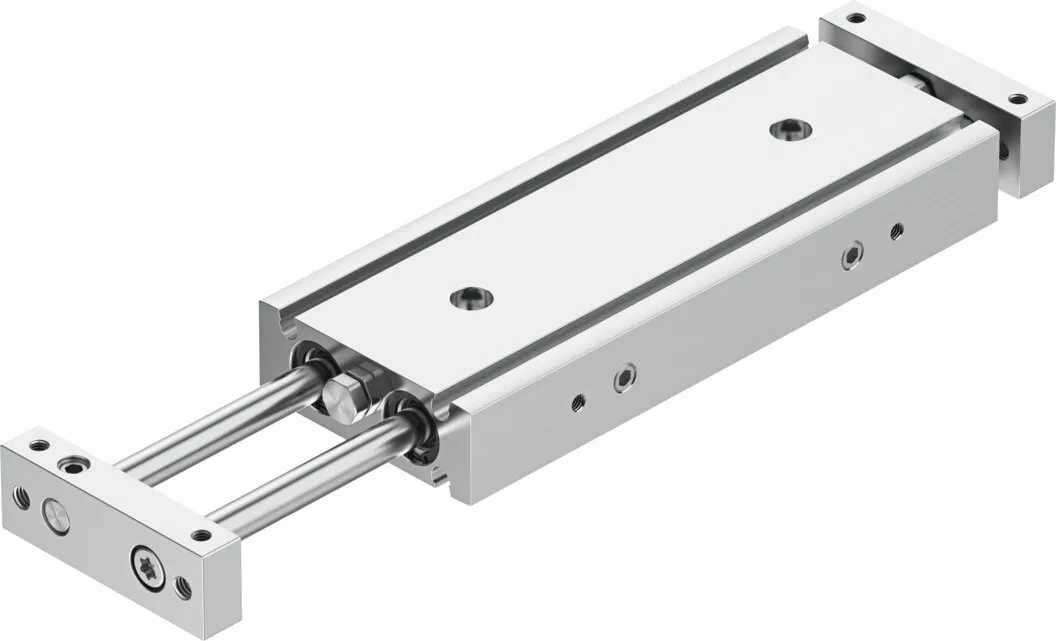 Minimal space requirement , Minimal mounting time , High resistance to torques and lateral forces , High rigidity thanks to its guide rods with large diameter and two plain-bearing bushes , Wide range of mounting options , Drive and guide unit in a single housing , Plain bearing