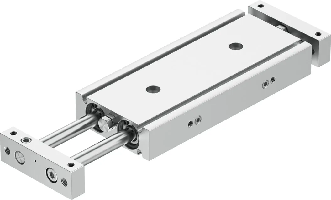 Minimal space requirement , Minimal mounting time , High resistance to torques and lateral forces , High rigidity thanks to its guide rods with large diameter and two plain-bearing bushes , Wide range of mounting options , Drive and guide unit in a single housing , Plain bearing