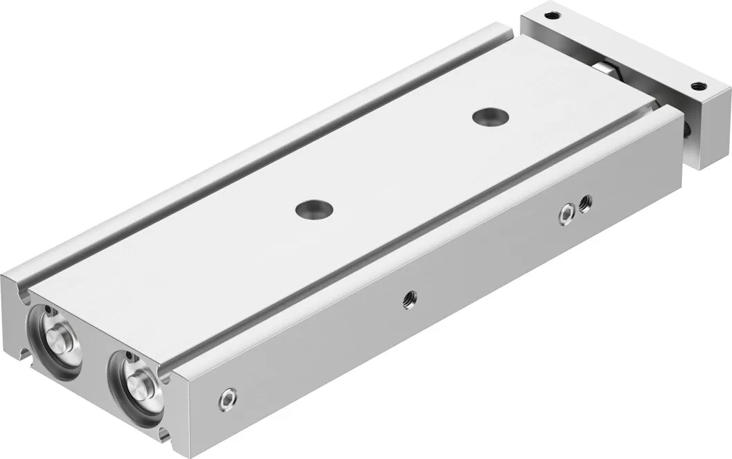Minimal space requirement , Minimal mounting time , High resistance to torques and lateral forces , High rigidity thanks to its guide rods with large diameter and two plain-bearing bushes , Wide range of mounting options , Drive and guide unit in a single housing , Plain bearing