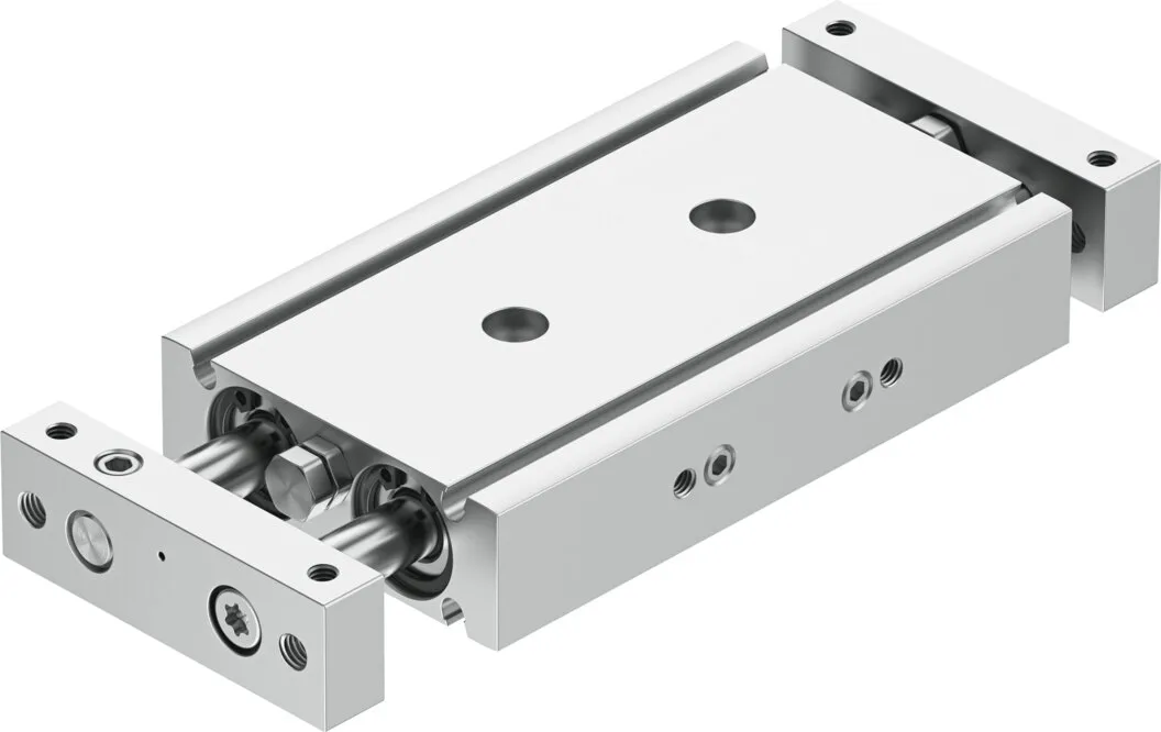 Minimal space requirement , Minimal mounting time , High resistance to torques and lateral forces , High rigidity thanks to its guide rods with large diameter and two plain-bearing bushes , Wide range of mounting options , Drive and guide unit in a single housing , Plain bearing