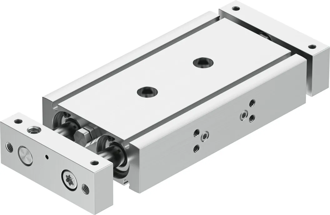 Minimal space requirement , Minimal mounting time , High resistance to torques and lateral forces , High rigidity thanks to its guide rods with large diameter and two plain-bearing bushes , Wide range of mounting options , Drive and guide unit in a single housing , Plain bearing