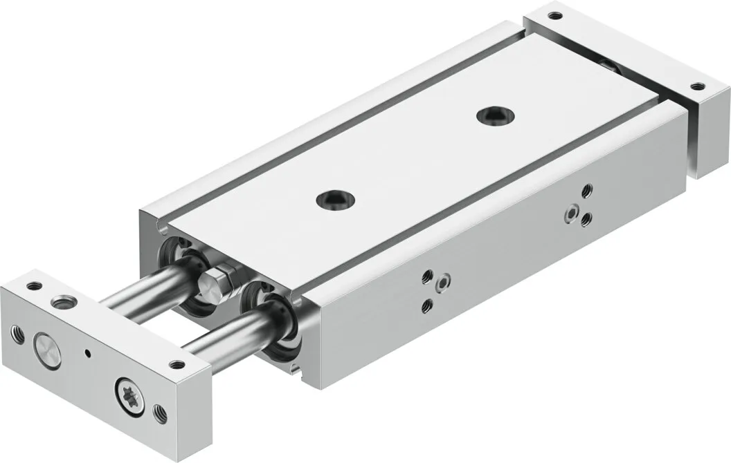 Minimal space requirement , Minimal mounting time , High resistance to torques and lateral forces , High rigidity thanks to its guide rods with large diameter and two plain-bearing bushes , Wide range of mounting options , Drive and guide unit in a single housing , Plain bearing