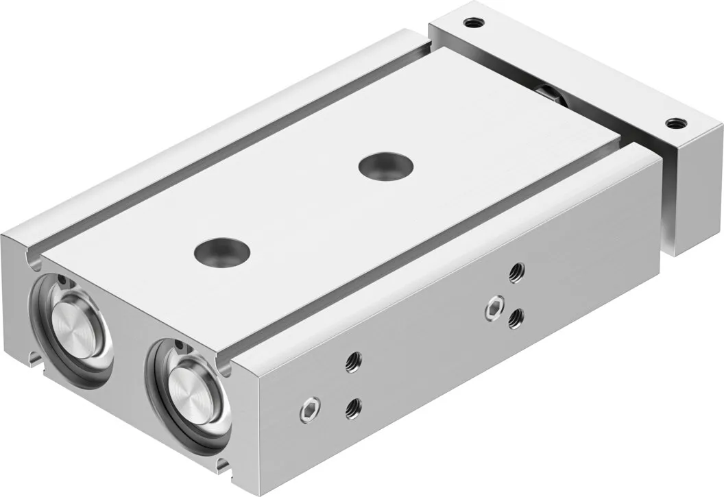Minimal space requirement , Minimal mounting time , High resistance to torques and lateral forces , High rigidity thanks to its guide rods with large diameter and two plain-bearing bushes , Wide range of mounting options , Drive and guide unit in a single housing , Plain bearing