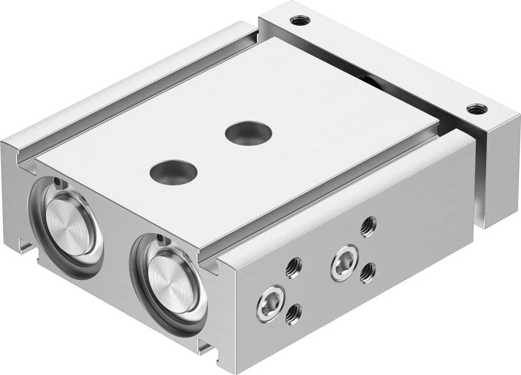 Minimal space requirement , Minimal mounting time , High resistance to torques and lateral forces , High rigidity thanks to its guide rods with large diameter and two plain-bearing bushes , Wide range of mounting options , Drive and guide unit in a single housing , Plain bearing
