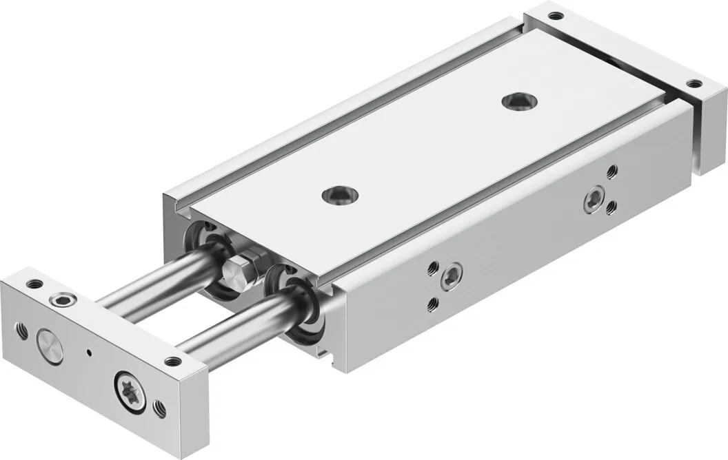 Minimal space requirement , Minimal mounting time , High resistance to torques and lateral forces , High rigidity thanks to its guide rods with large diameter and two plain-bearing bushes , Wide range of mounting options , Drive and guide unit in a single housing , Plain bearing