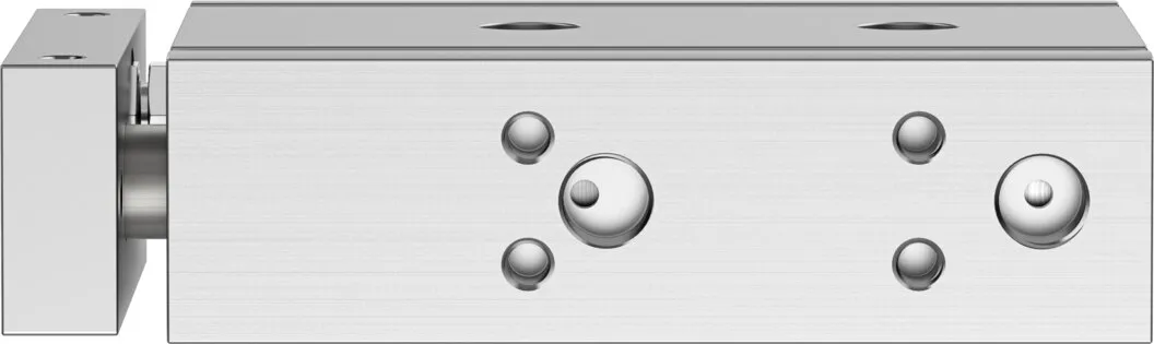 Minimal space requirement , Minimal mounting time , High resistance to torques and lateral forces , High rigidity thanks to its guide rods with large diameter and two plain-bearing bushes , Wide range of mounting options , Drive and guide unit in a single housing , Plain bearing