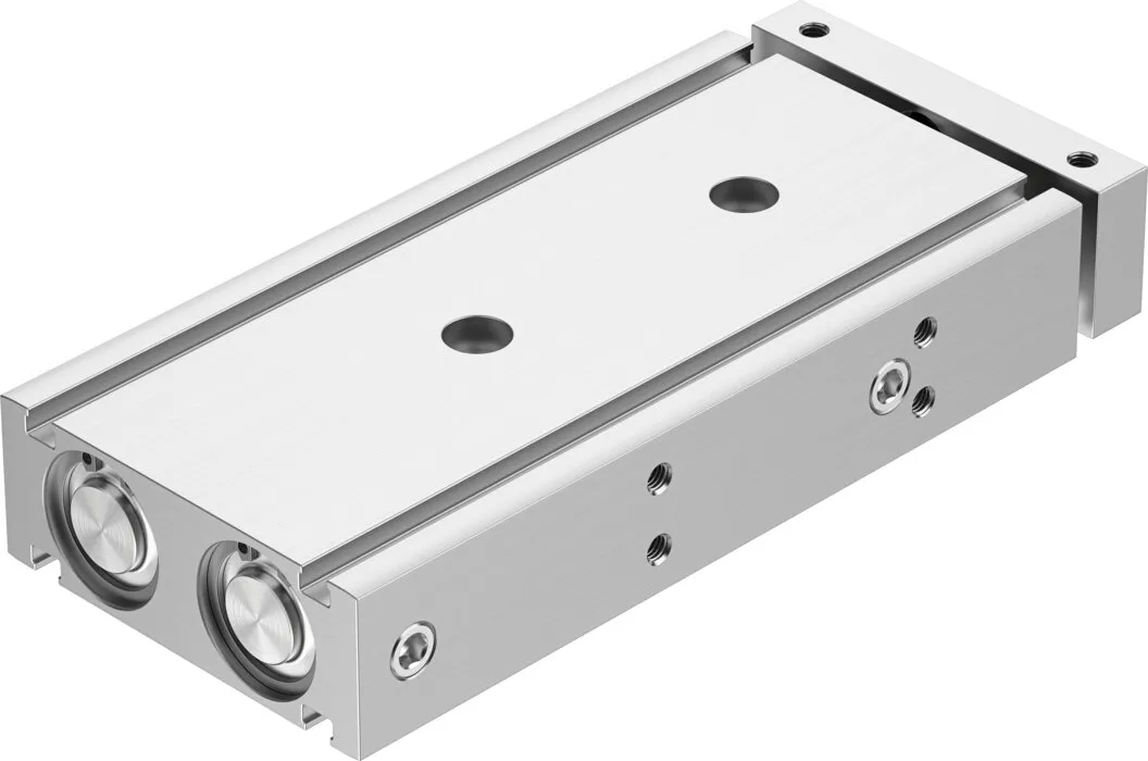 Minimal space requirement , Minimal mounting time , High resistance to torques and lateral forces , High rigidity thanks to its guide rods with large diameter and two plain-bearing bushes , Wide range of mounting options , Drive and guide unit in a single housing , Plain bearing