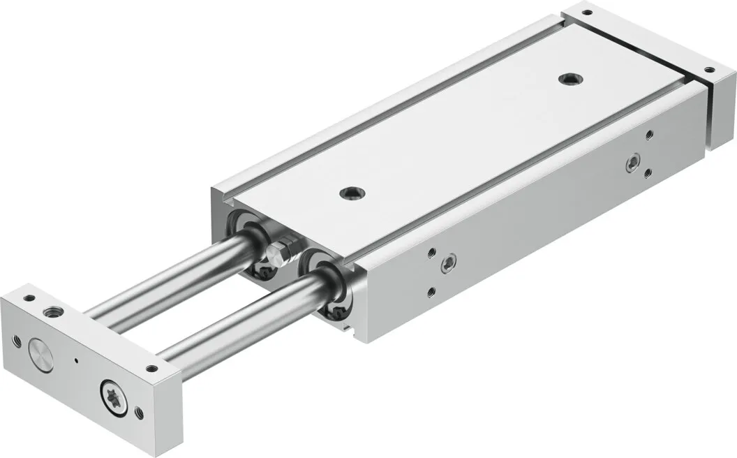 Minimal space requirement , Minimal mounting time , High resistance to torques and lateral forces , High rigidity thanks to its guide rods with large diameter and two plain-bearing bushes , Wide range of mounting options , Drive and guide unit in a single housing , Plain bearing